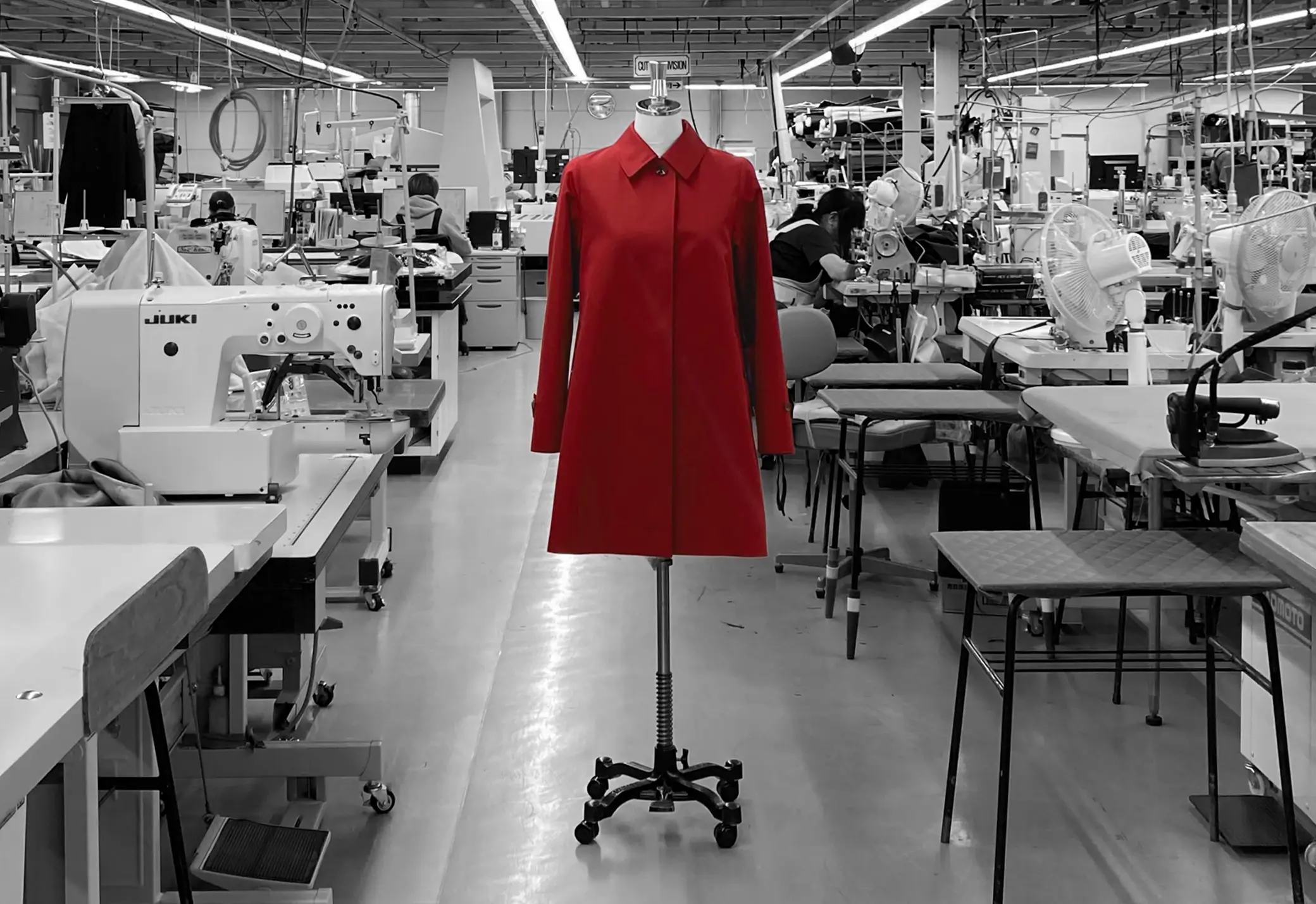 職人の技と感性が継承された、世界的にも珍しいコートに特化した縫製工場です。技術を支えるのは平均勤続年数20年の職人たち。中には、工場設立時から在籍するスタッフもおり、高い技術が受け継がれています。工場を見守る工場長はこう語ります、「質の高いコート作りに欠かせないのは、現場で迷わずに縫製するための工業パターン技術、熟練工たちによる高度な縫製技術、そして特殊な仕上げ技術」。