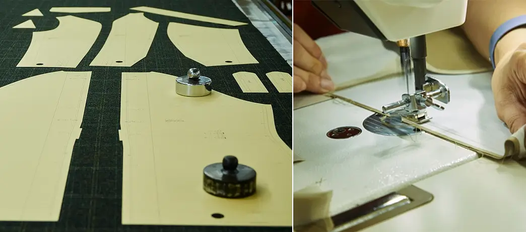 今回のコラボレーションコートを一枚製作するには、90以上ものパーツを高度な技術で組み立てて完成します。専用の裁断機を使った生地の裁断や、コートの身頃などを縫製する際に用いられる「引き縫い」という技術など、さまざまなクラフトマンシップにより、高精度なコートが仕上がります。