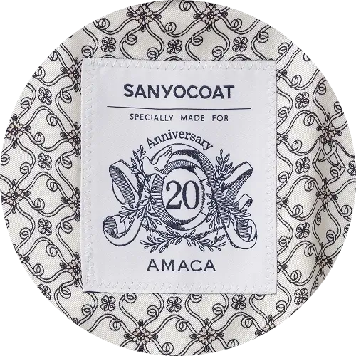 アニバーサリーイヤーを記念して作られたAMACA20周年ロゴと、SANYOCOATロゴを配した、オリジナルネーム。このコートにのみにつく、限定ロゴです。 -