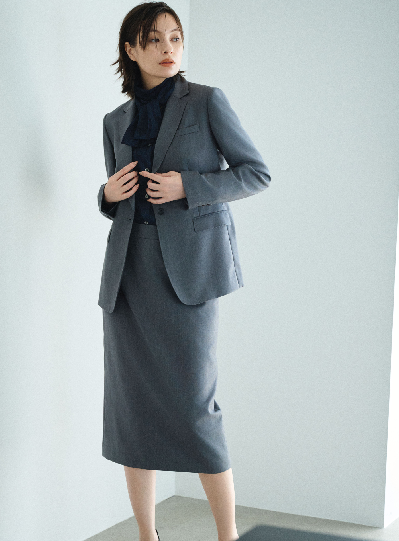 ストライプを織り柄で上品に表現した、無地とはさりげなく一線を画す素材を使用。ウールにカシミヤとシルクを混紡し、なめらかな肌ざわりとしっとりとした光沢、快適な着心地が特徴です。素材の良さが引き立つシンプルなIラインスカートを合わせれば、凛とした女性像に。インナーにはペイズリー柄のカットジャカードボウタイブラウスを選び、シックな中にも華やかさを添えて。