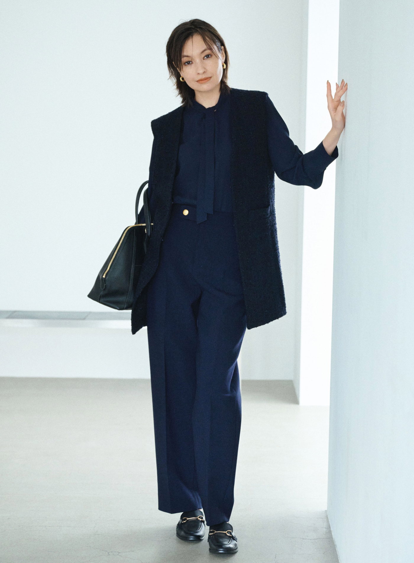 何色ものネイビーを織り合わせた、深みのある発色が美しいオリジナルツイード素材。ラメ糸が散りばめられており、控えめながらもエレガントなきらめきを放ちます。全身を素材違いのネイビーで揃えることで、上級者の着こなしに。トレンドを感じさせるジレは、インナーを変えていくことで長く着られる点も魅力。ニットを合わせれば初冬まで活躍します。