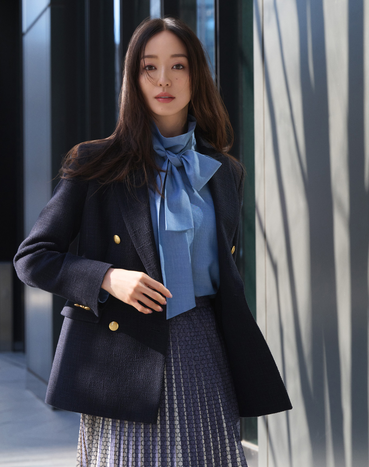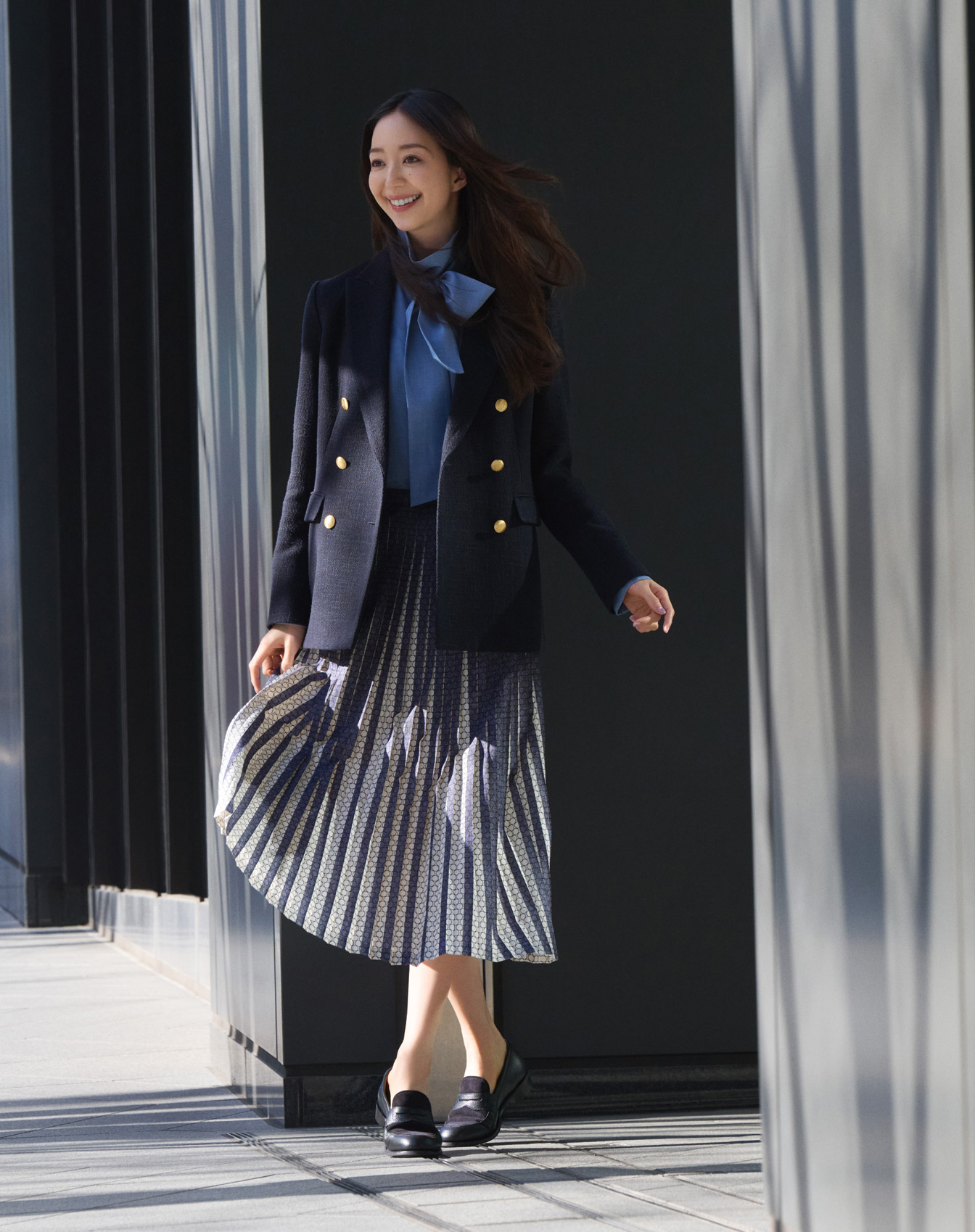 金ボタンが映える紺ブレは、オリジナルのライトツイードで知性と品格を宿す大人のトラッドの象徴。胸元を彩るボウブラウスは、ダンガリー素材ならではのカジュアルとエレガンスが絶妙なバランスで、紺ブレに今どきの華やかさをプラス。プリーツスカートもデニム調プリントを重ねた奥行きのある素材で、歩くたびにドラマティックな表情に。軽やかさの中に品格が漂う、洗練のトラッドスタイルを楽しみたい。