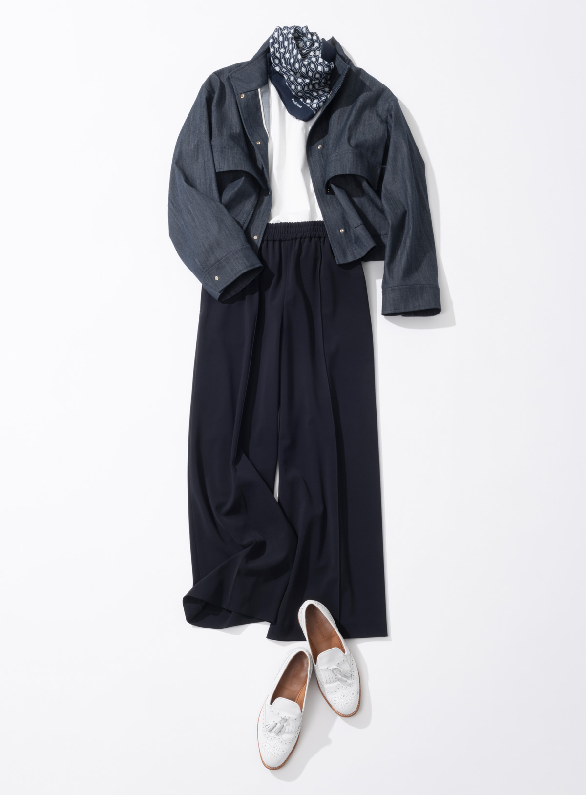 シンプルなスタイルこそ、素材や仕立ての良さが際立つもの。ブルゾンは薄手のデニム素材を使用し、シャツ感覚で羽織れる軽やかな着心地。白のカットソーで抜け感をつくり、ワイドパンツでほどよいラフ感をプラスしました。センタークリースが品よく見せてくれるのも、大人には嬉しいポイントです。仕上げに巻いたスカーフで、上品な遊び心を添えて。