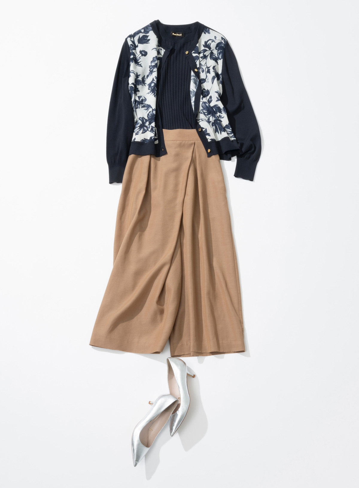 上品な光沢とシアー感を兼ね備えたニットに、花柄プリントを重ねたカーディガンと半袖プルオーバーのアンサンブルニット。奥行きのあるエレガントな表情が魅力です。柔らかな落ち感のダンガリー素材のワイドパンツを合わせて、こなれた印象に。ラップ風デザインとスカート見えするシルエットでトレンド感を添えつつ、短め丈のアンサンブルニットでスタイルアップも叶えます。