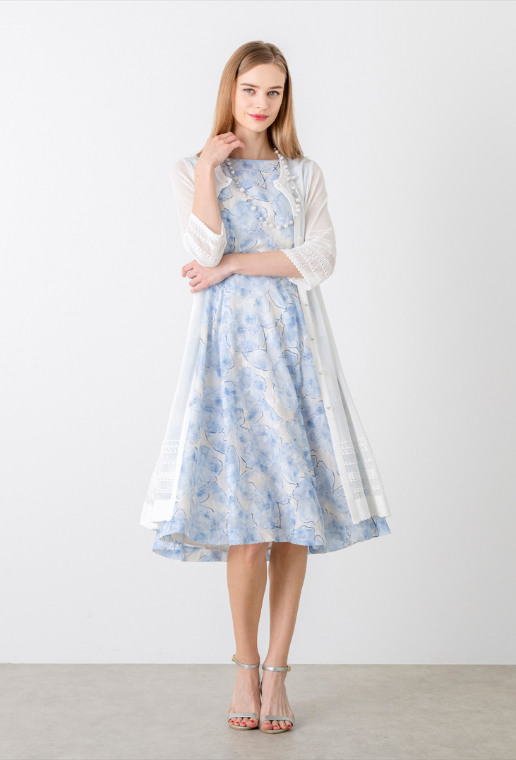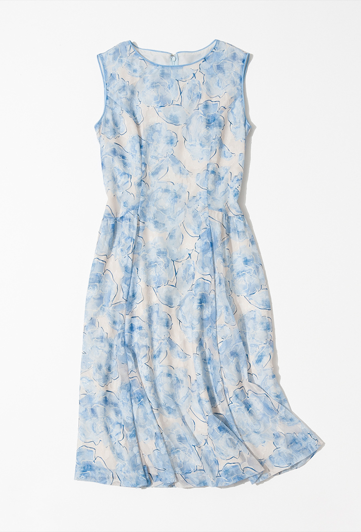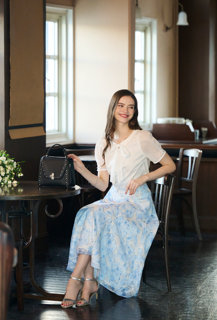 ラフタッチなローズプリントが、クラシックな品格とトレンド感を融合させ、光の角度で異なる美しさを演出します。