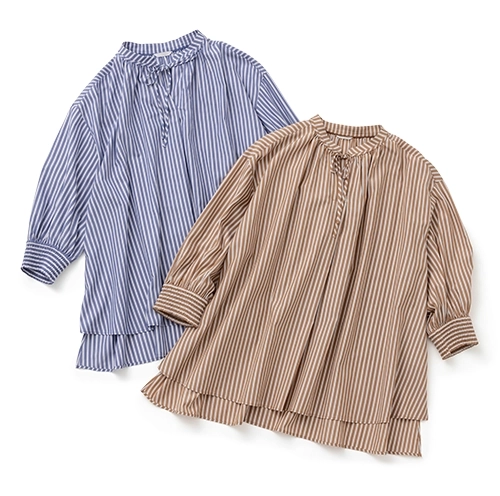 襟元にギャザーを施したチュニック丈ブラウス。後襟ぐりにも分量感のあるギャザーを入れているので、パンツ合わせにぴったりのデザインです。秋らしく、ネイビーとキャメルストライプの2色展開。