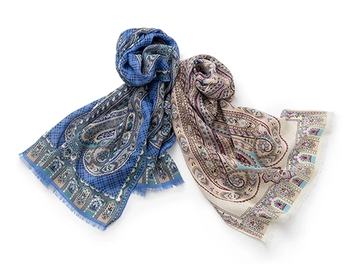 AMACAのスタンダードであるイタリアBINDA社のストール。格子とペイズリーモチーフをかけあわせた図案は巧妙かつ存在感があり、シンプルなニット、ダークカラーのアウターに合わせるとお顔周りが明るい印象になります。