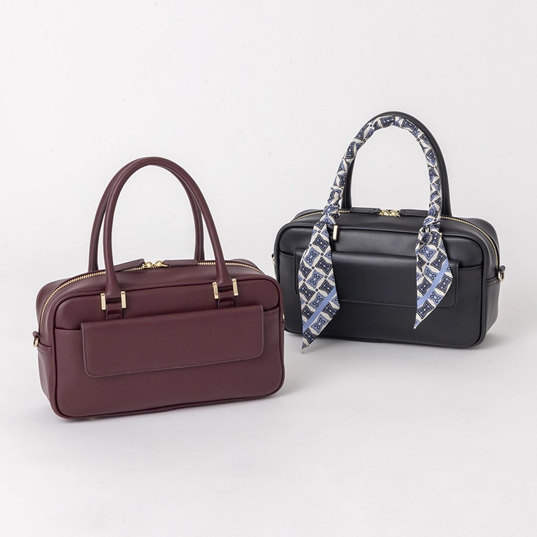 横長のミニマルなデザインながら、上質な牛革を使った高級感漂うレザーハンドバッグ。ON / OFF様々なシーンで活躍できるので、コーディネートを選びません。持ち手にスカーフを巻いて、遊びごころをプラス。