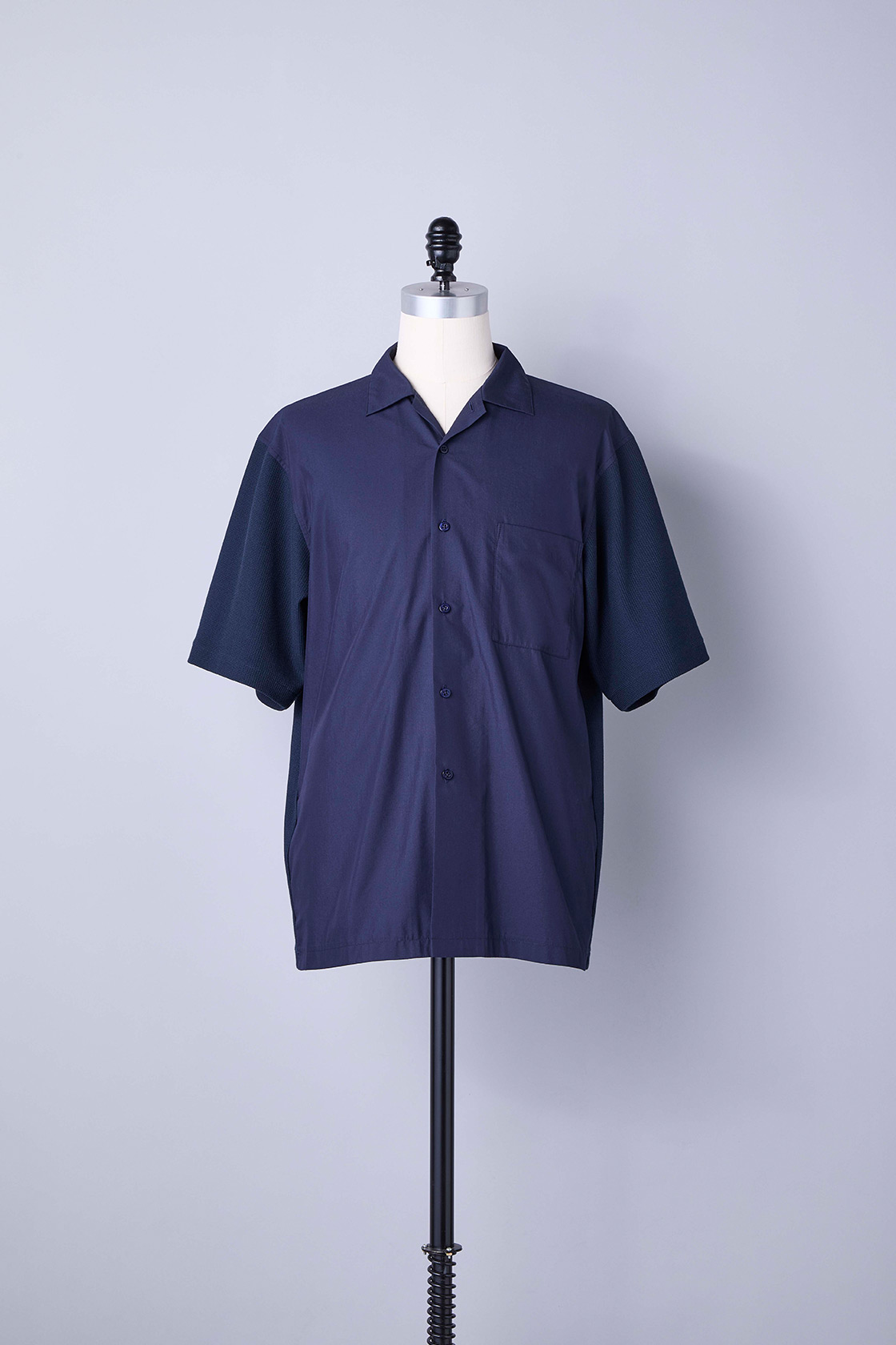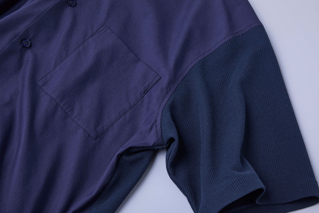 このシャツは、ケーブルニットとブロード素材を組み合わせることで、デザイン性の高さと快適な着心地を両立させています。前身頃と襟にはブロードのなめらかな肌触りと上品な光沢があり、きちんとした印象を演出。一方、動きの多い背面と袖には伸縮性のあるニット素材を使用しました。