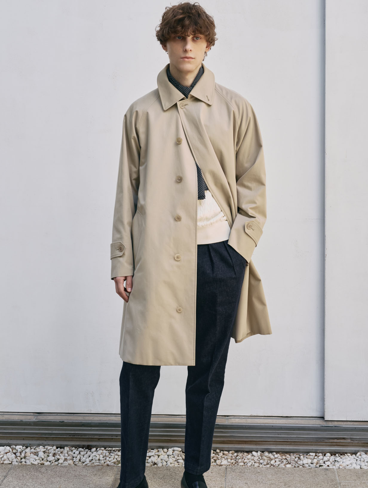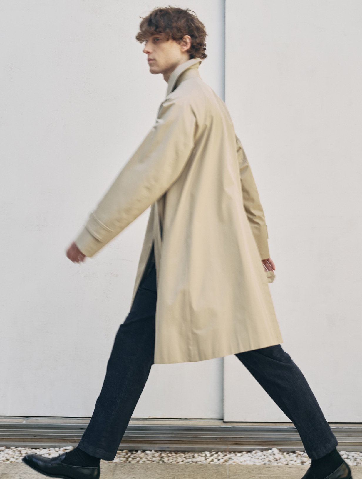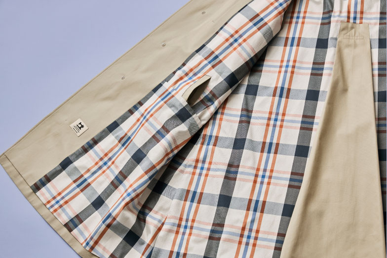 「映画『ぼくの伯父さん』で監督ジャック・タチ自身が演じたユロのように、コートを羽織って自転車で移動する、そんな軽快なデイリースタイルをイメージしながらデザインに当たりました。そこで、既存の100年コートが採用している70/2のギャバジンよりもさらに繊細な80/2ギャバジン素材を使うことで軽さを実現しました。日常の様々な場面で気軽に手に取って頂けるコートになって欲しいですね」