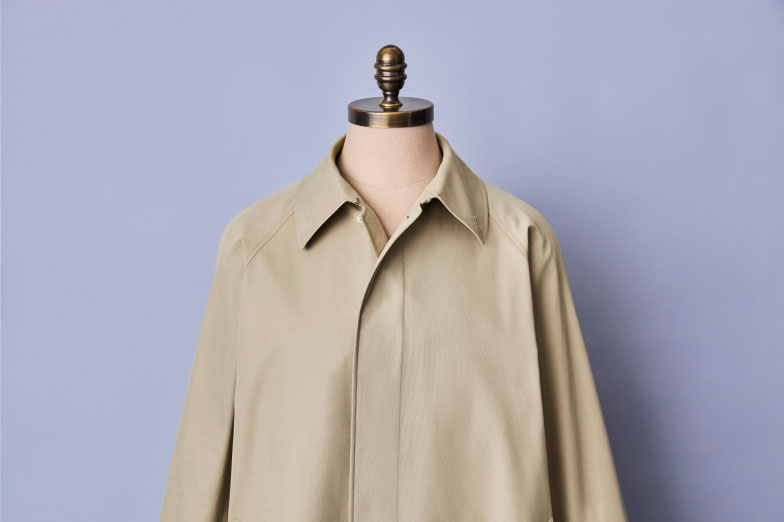 コートの顔とも言える襟は青森ファクトリーの熟練工による手縫いで仕上げ、丸みを帯びたラグランスリーブと相まって柔らかな表情に。また、第一ボタンとホックを留めれば、高さを持たせた後襟から前方へつながるステンカラーらしいミニマルな襟型を主張します。