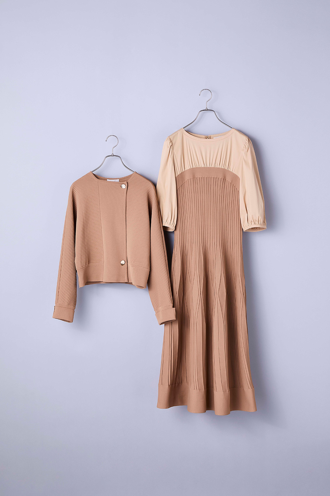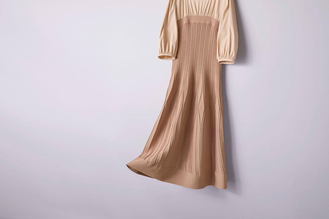 そんな気分にちょうどいいのが、こっくりしたベージュの羽織りと七分袖ワンピースのセットアップ。ポリエステル100%の生地は、ドライタッチで軽やかな着心地が魅力です。