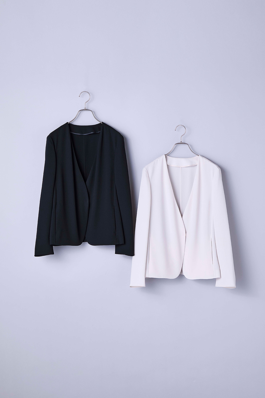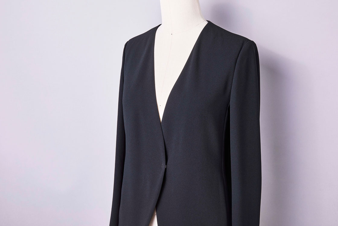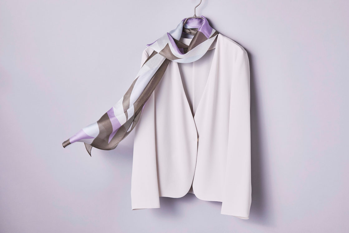 注目すべきは、その軽やかさ。ふわっと羽織れるのに、きちんと感を損なわないのは、コシとハリのあるジョーゼット素材のおかげ。オンスタイルでも、上品なムードをきちんとキープしてくれます。
