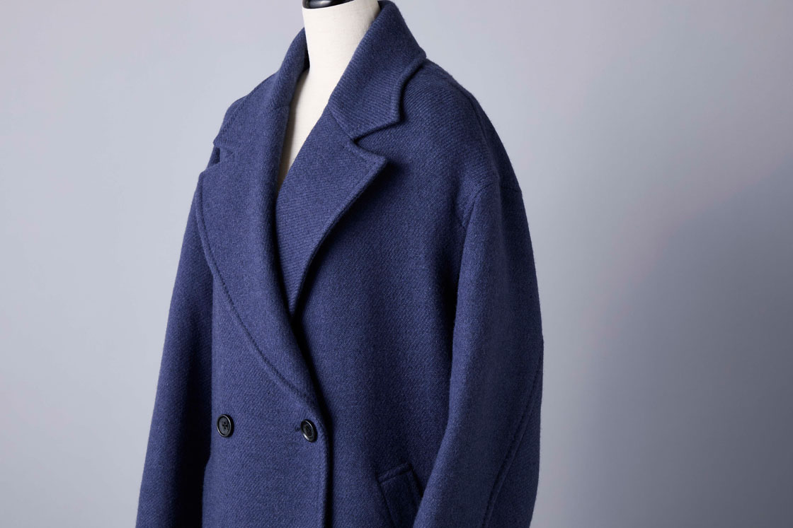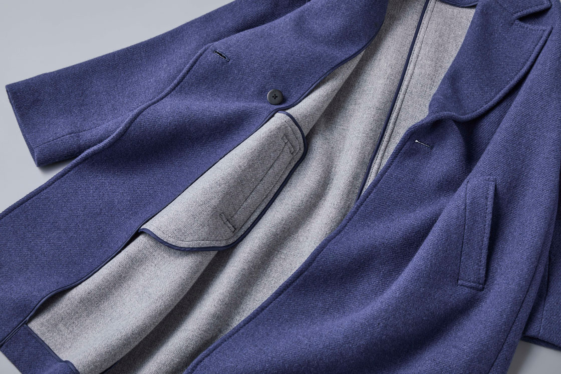 ポール・スチュアートのコート「Air Fab」に用いられているのは、糸の紡績から機織りまで、すべての工程に時間と手間を惜しまず仕上げた上質なウール素材。紡績段階で多くの空気を含ませることで、ウール本来の軽さ・柔らかさ・暖かさを最大限に引き出しています。織り上げの工程では、一本一本の糸を丁寧に扱いながら、ゆっくりと時間をかけて織り上げ、仕上げ段階でも生地に余分なストレスを与えないように加工。