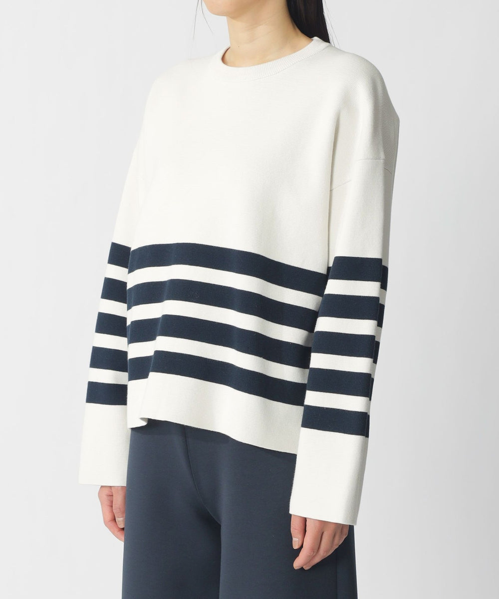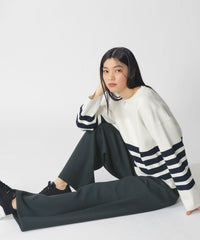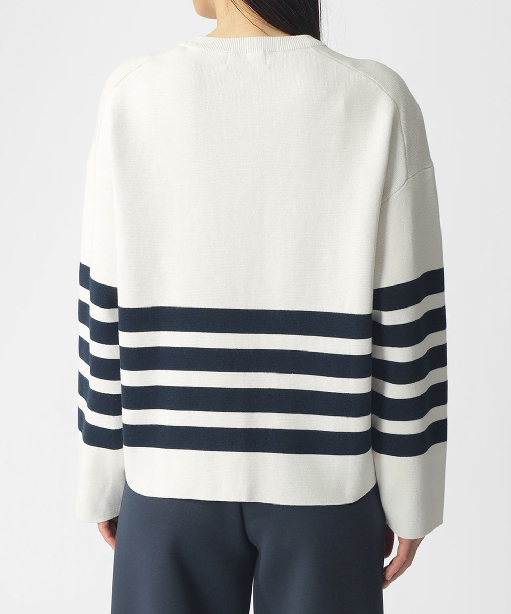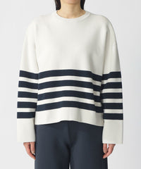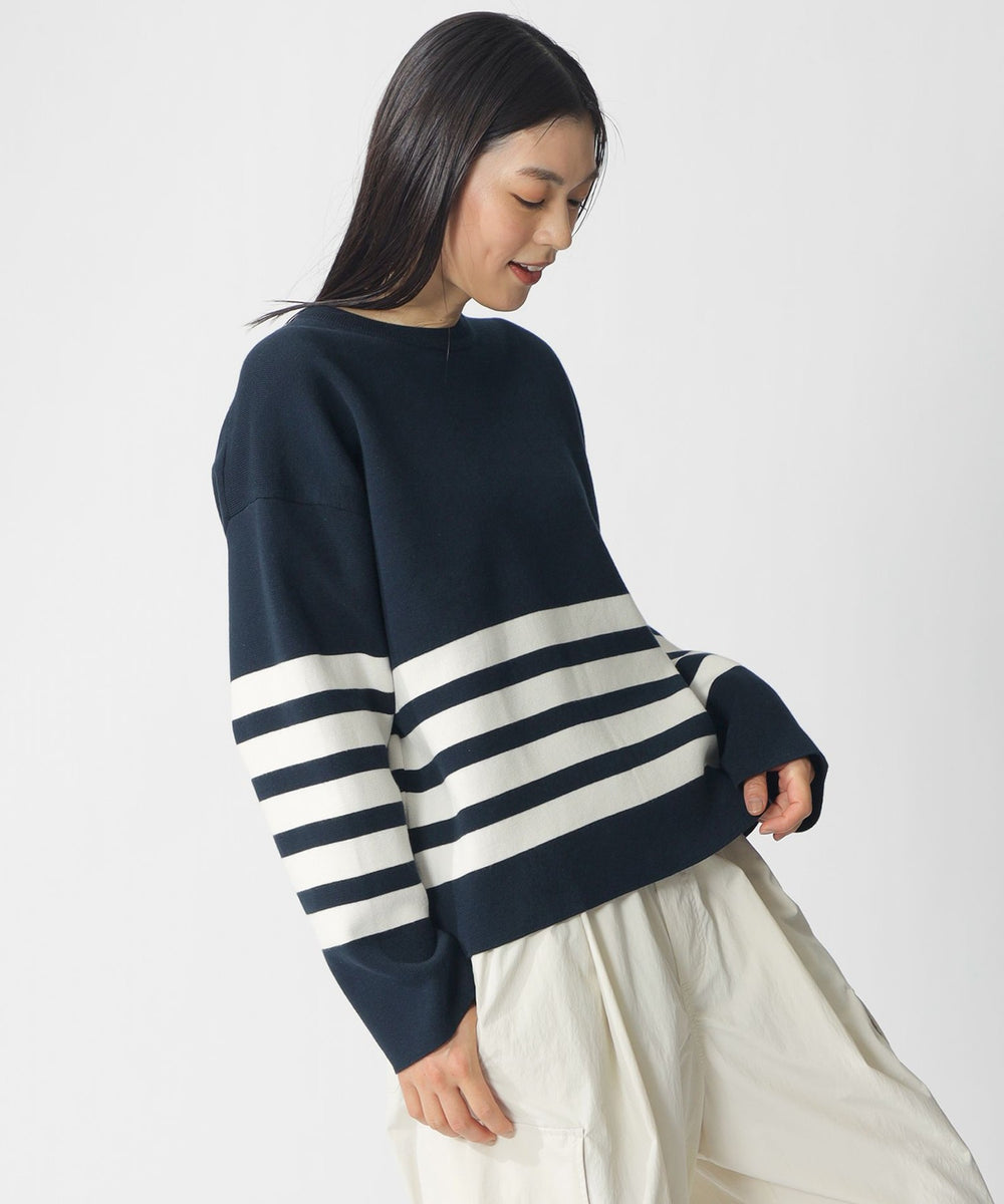 パネルボーダーとカラーリングがマリンテイストなプルオーバーニット。