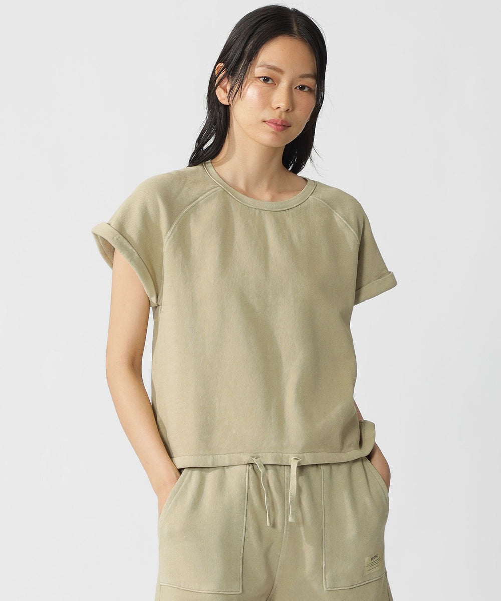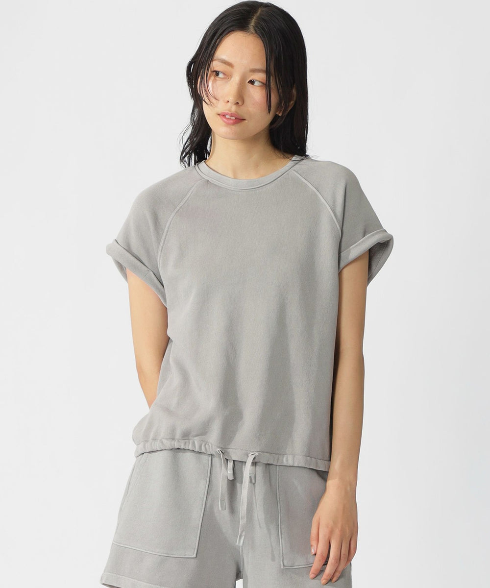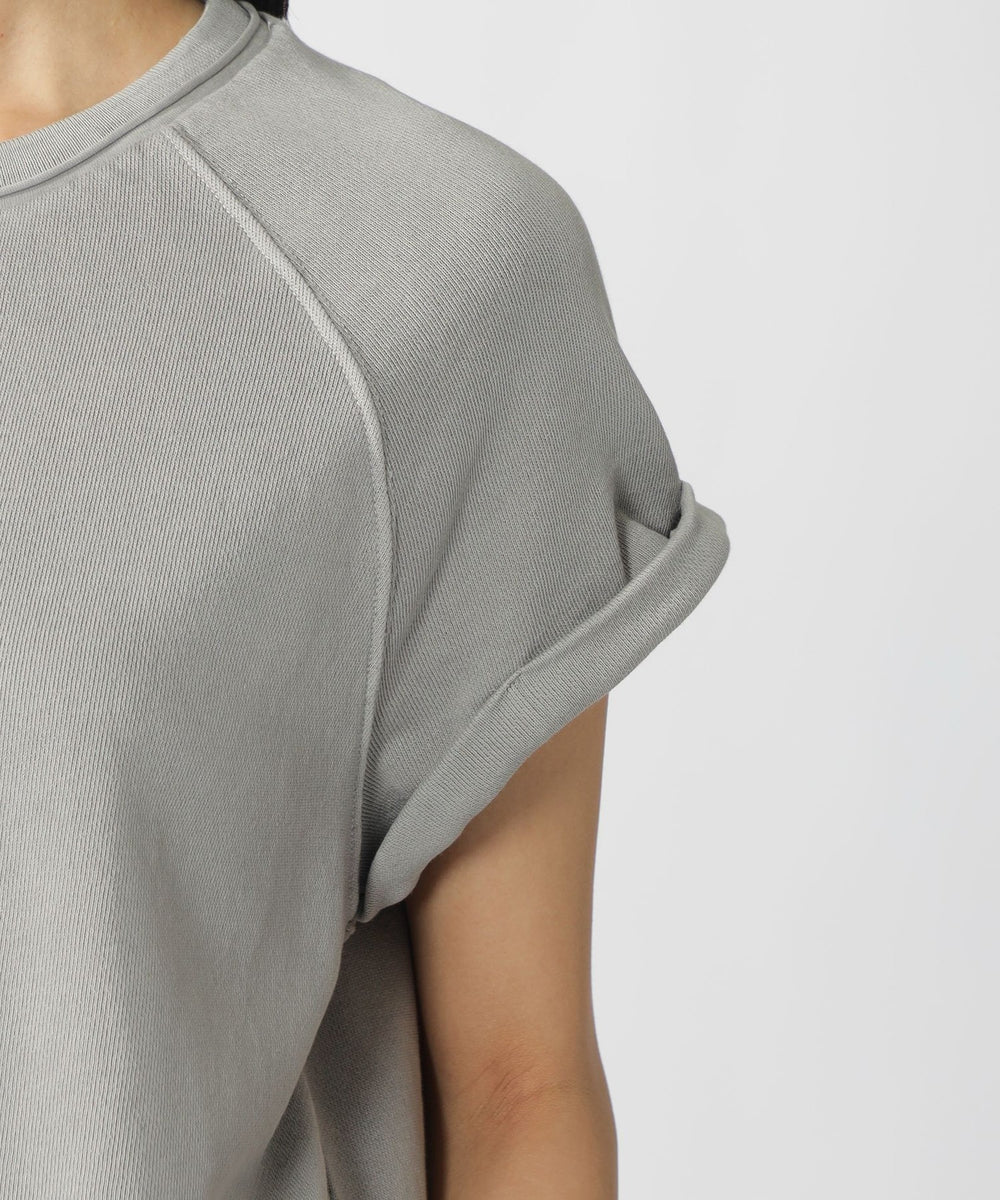 ラグランスリーブデザインのスウェットTシャツ。袖口の切りっぱなしデザインがポイント。