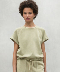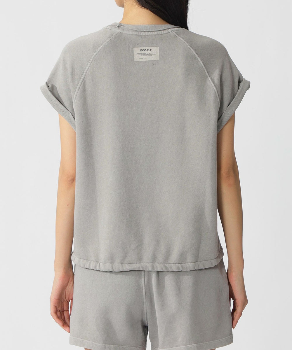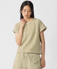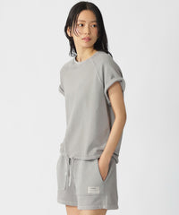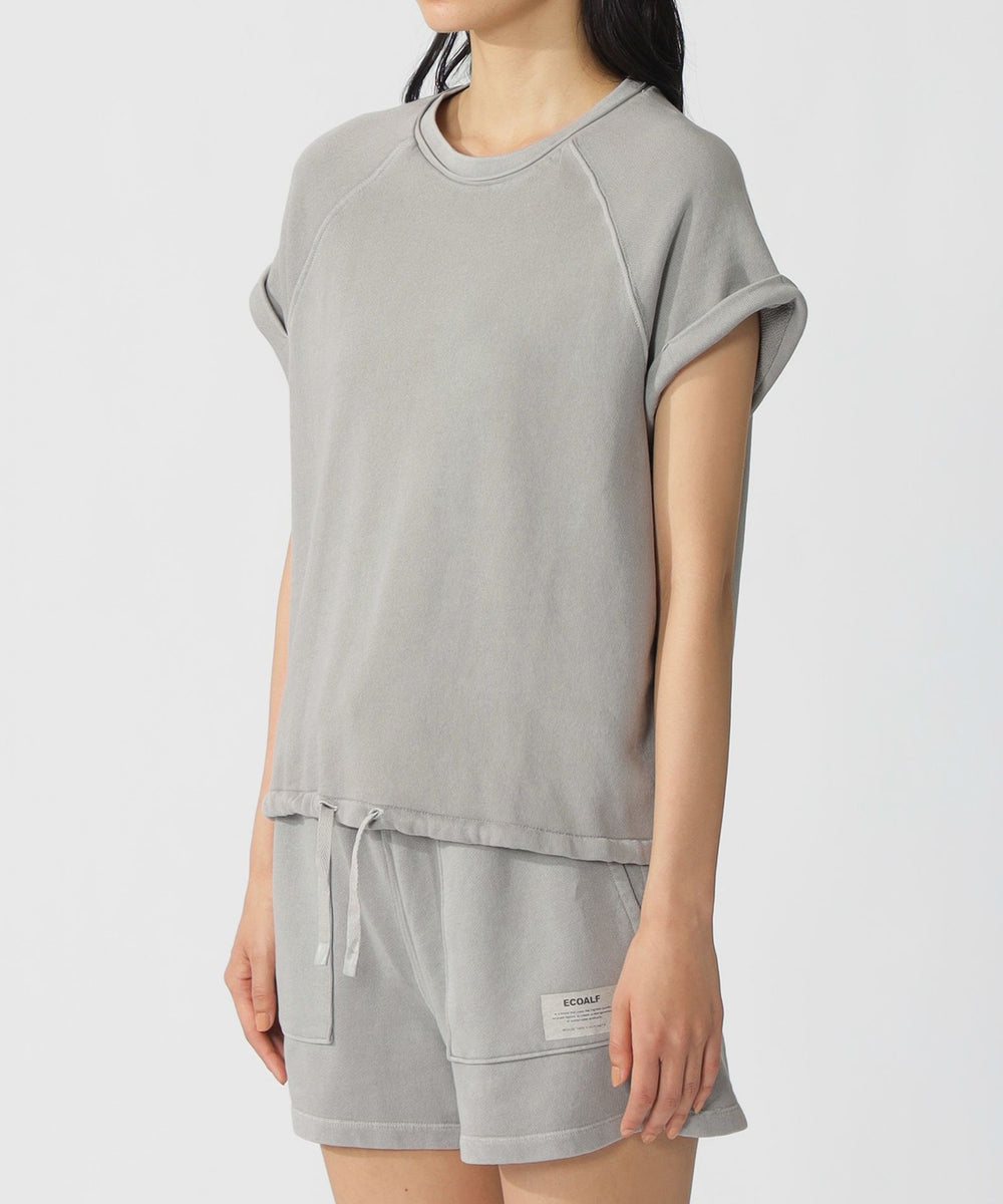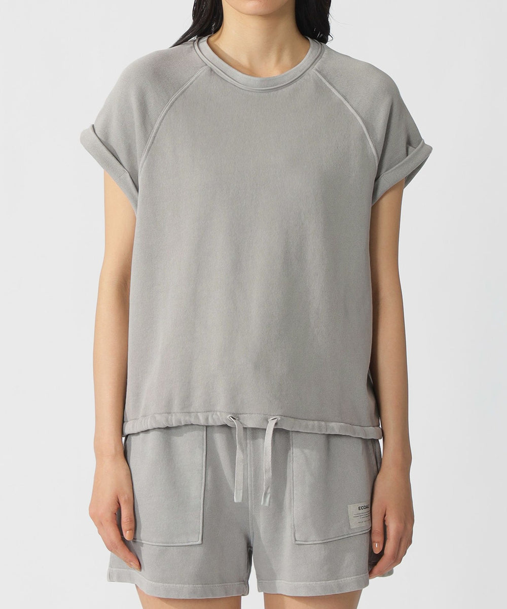 ラグランスリーブデザインのスウェットTシャツ。袖口の切りっぱなしデザインがポイント。