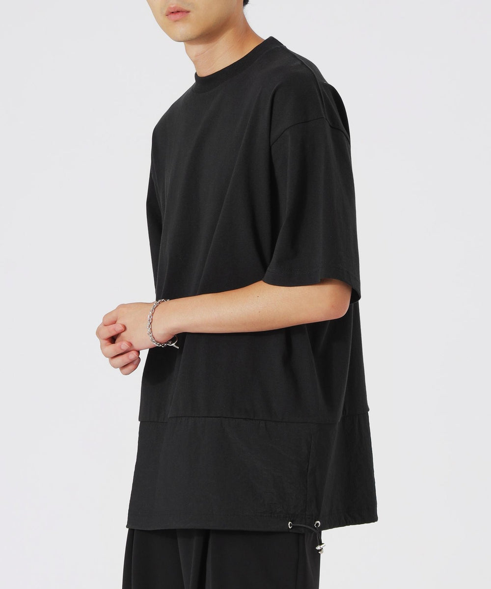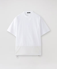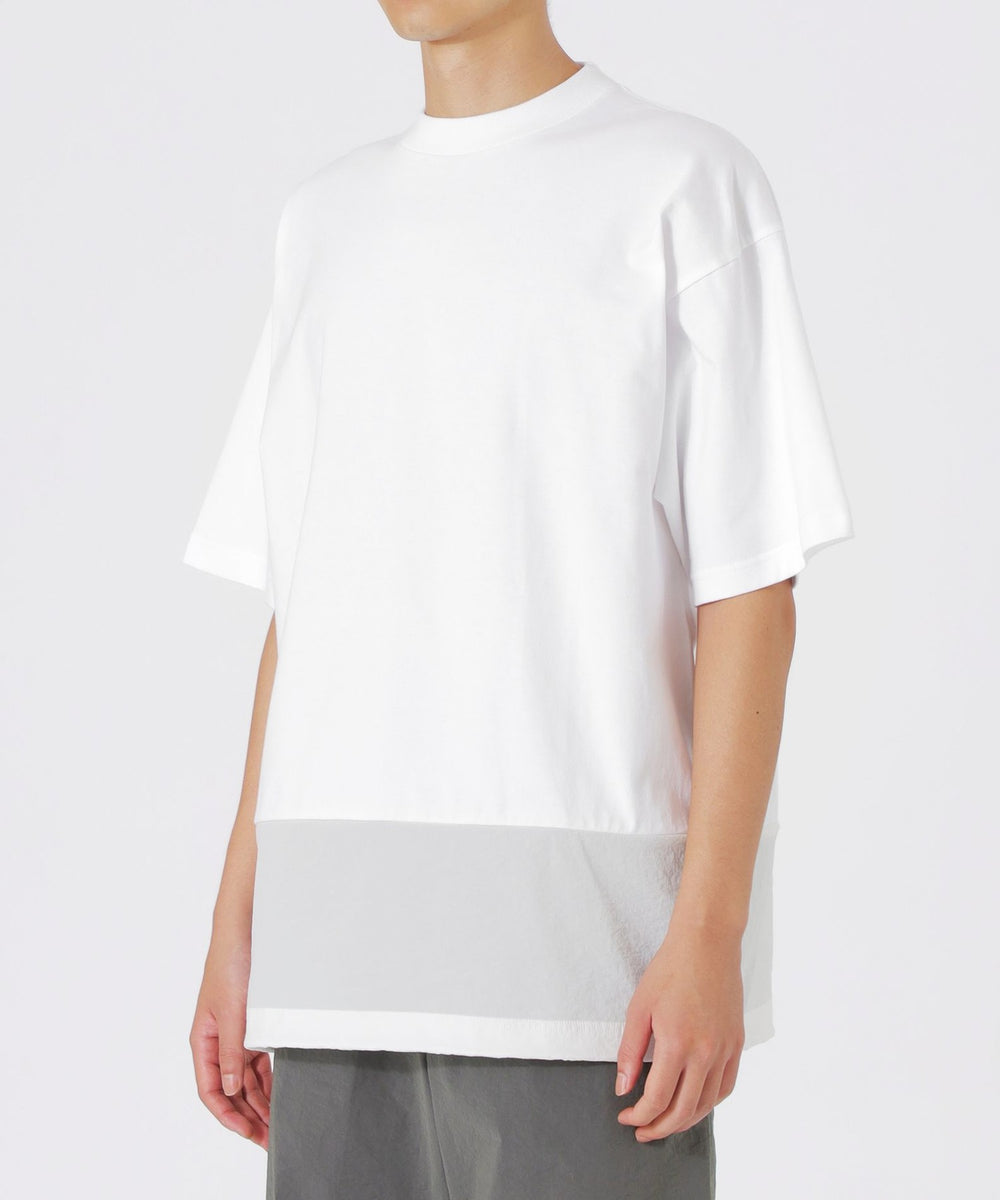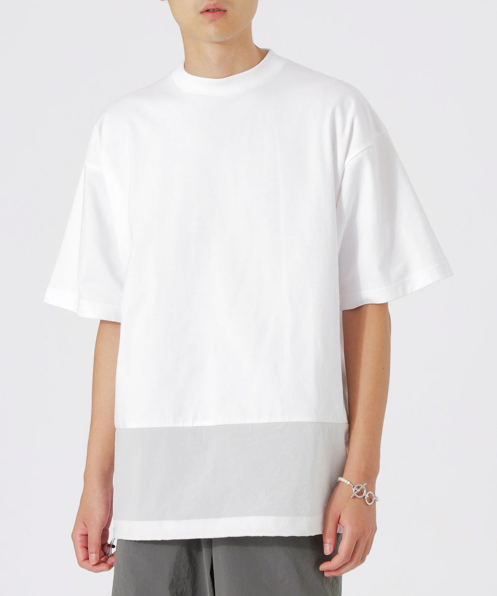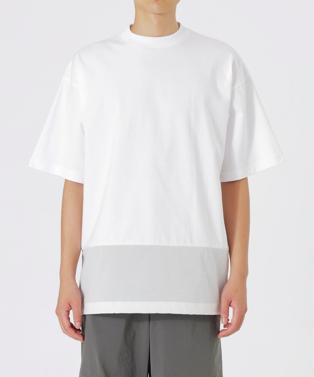 一見シンプルに見えるTシャツですが、天竺素材とナイロン素材をドッキングさせることで、ちょっとしたデザインのアクセントとなり、他のTシャツとは一線を画しています。ナイロン素材が施された部分が視覚的なポイントになり、着るだけで洗練されたスタイルが完成します。
