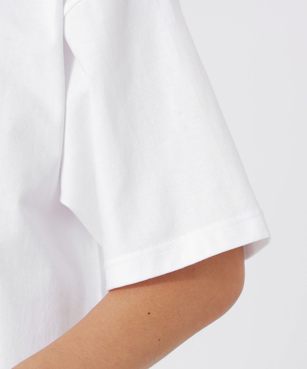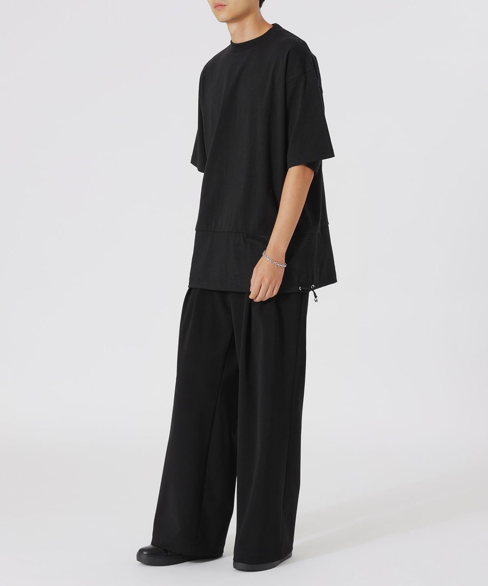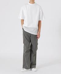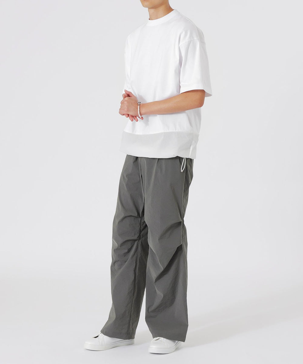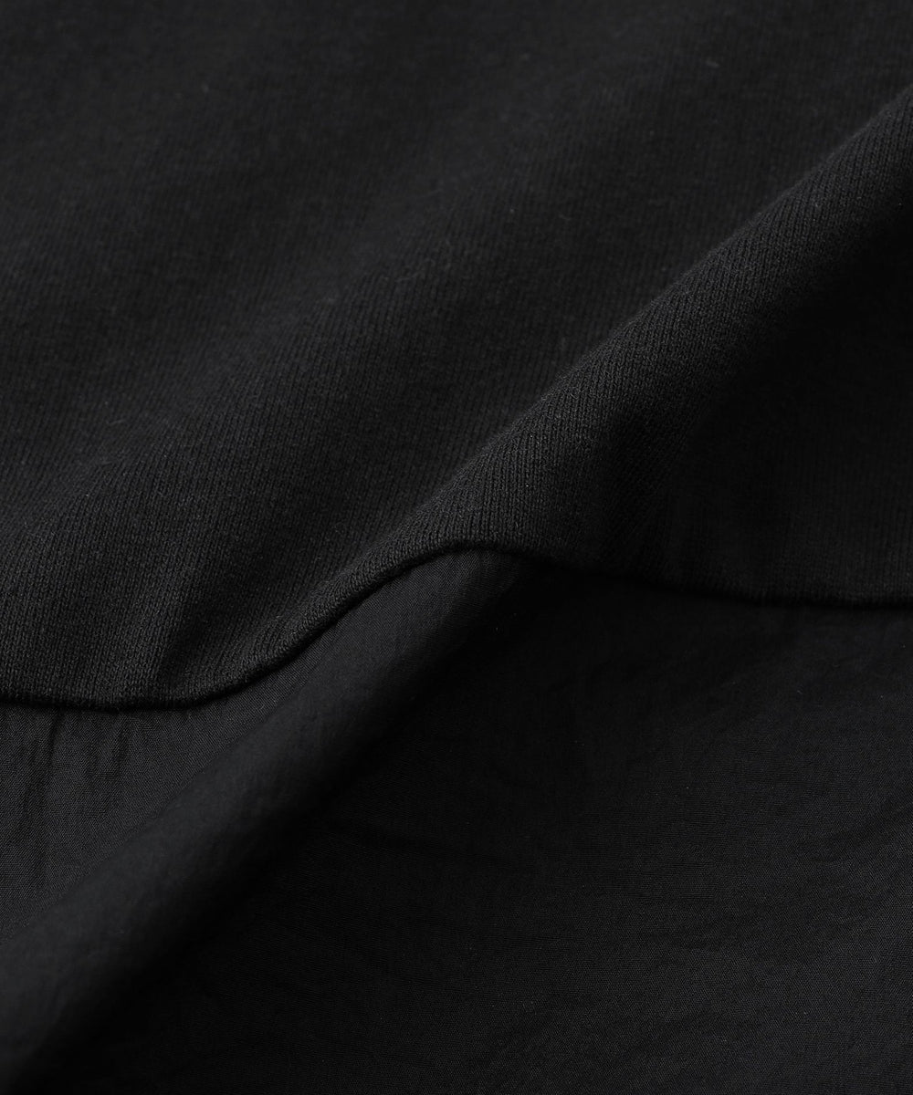 一見シンプルに見えるTシャツですが、天竺素材とナイロン素材をドッキングさせることで、ちょっとしたデザインのアクセントとなり、他のTシャツとは一線を画しています。ナイロン素材が施された部分が視覚的なポイントになり、着るだけで洗練されたスタイルが完成します。