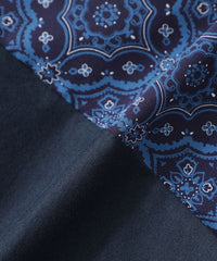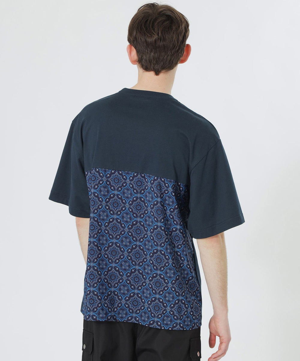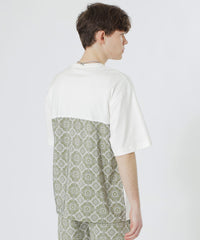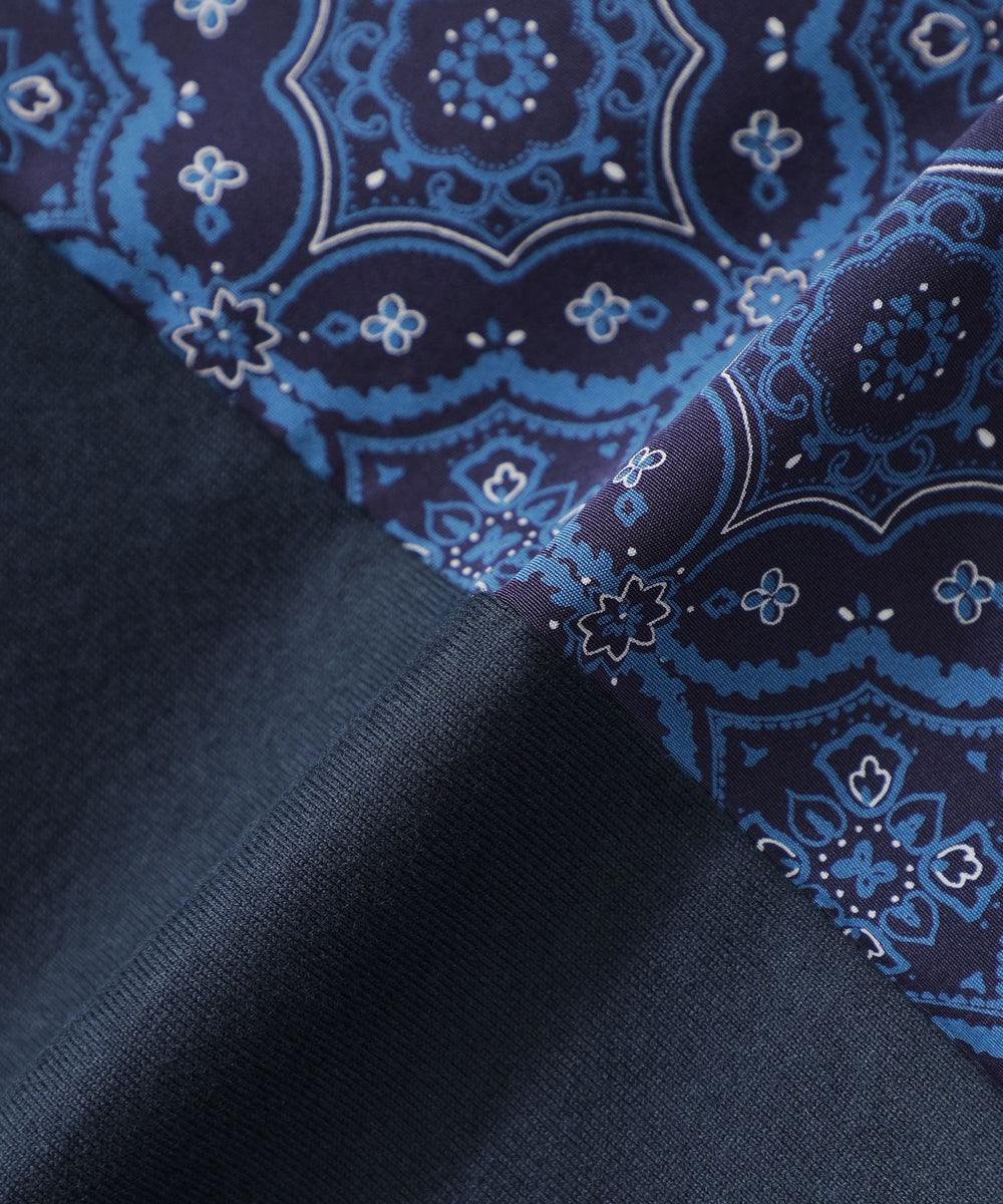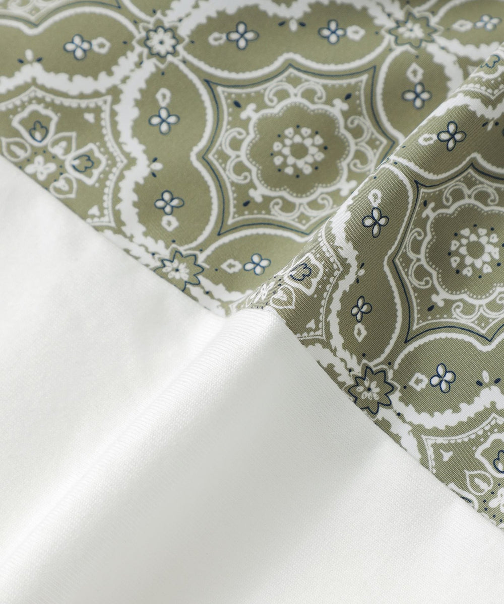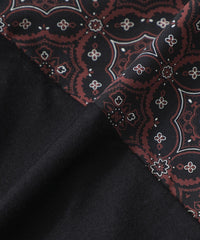 オリジナルで作成したオーナメント柄の布帛生地と無地のカットソー素材を大胆にブロッキングしたデザインです。