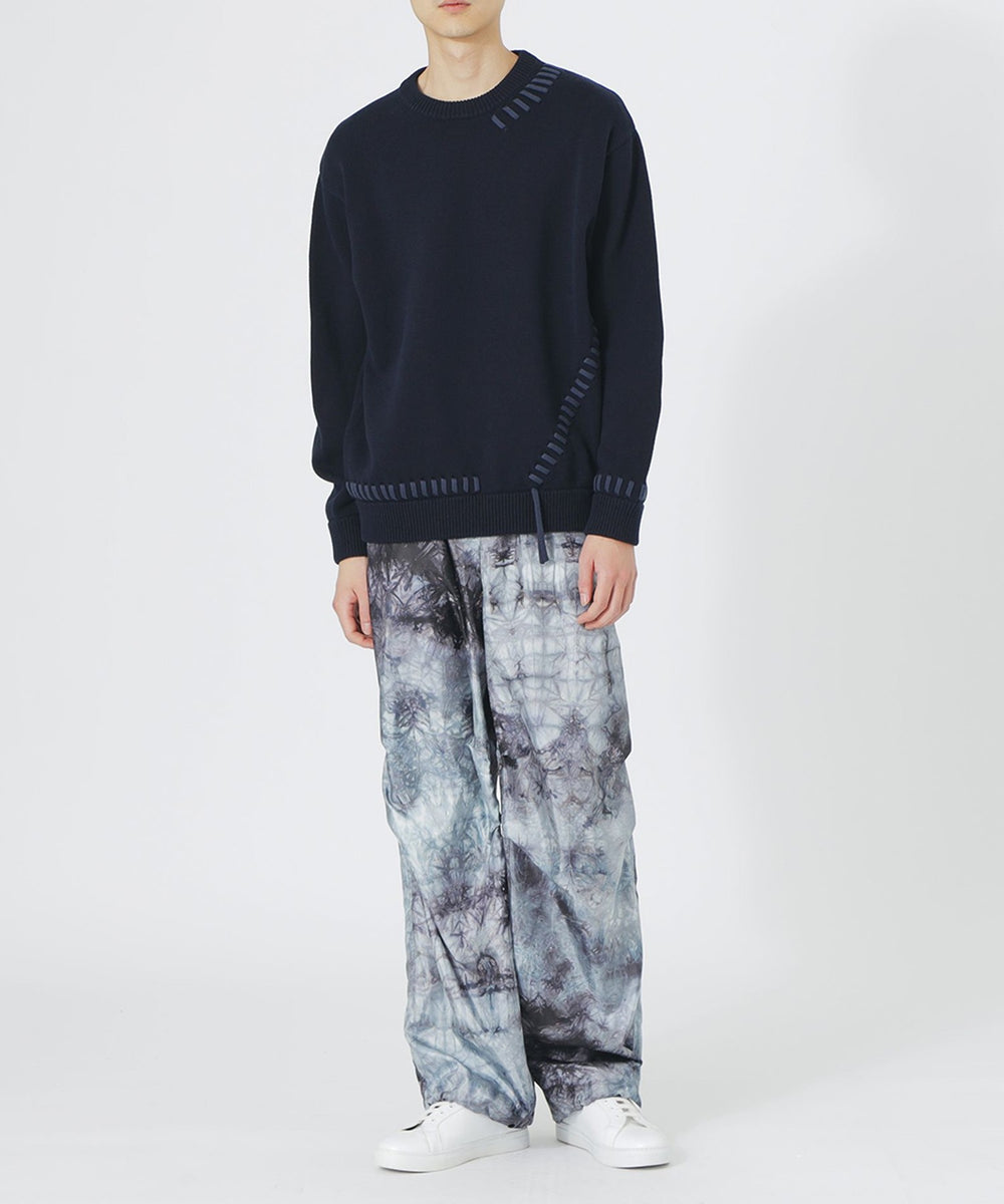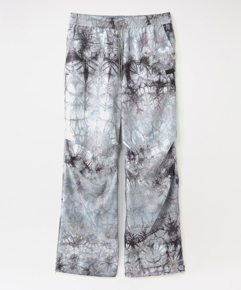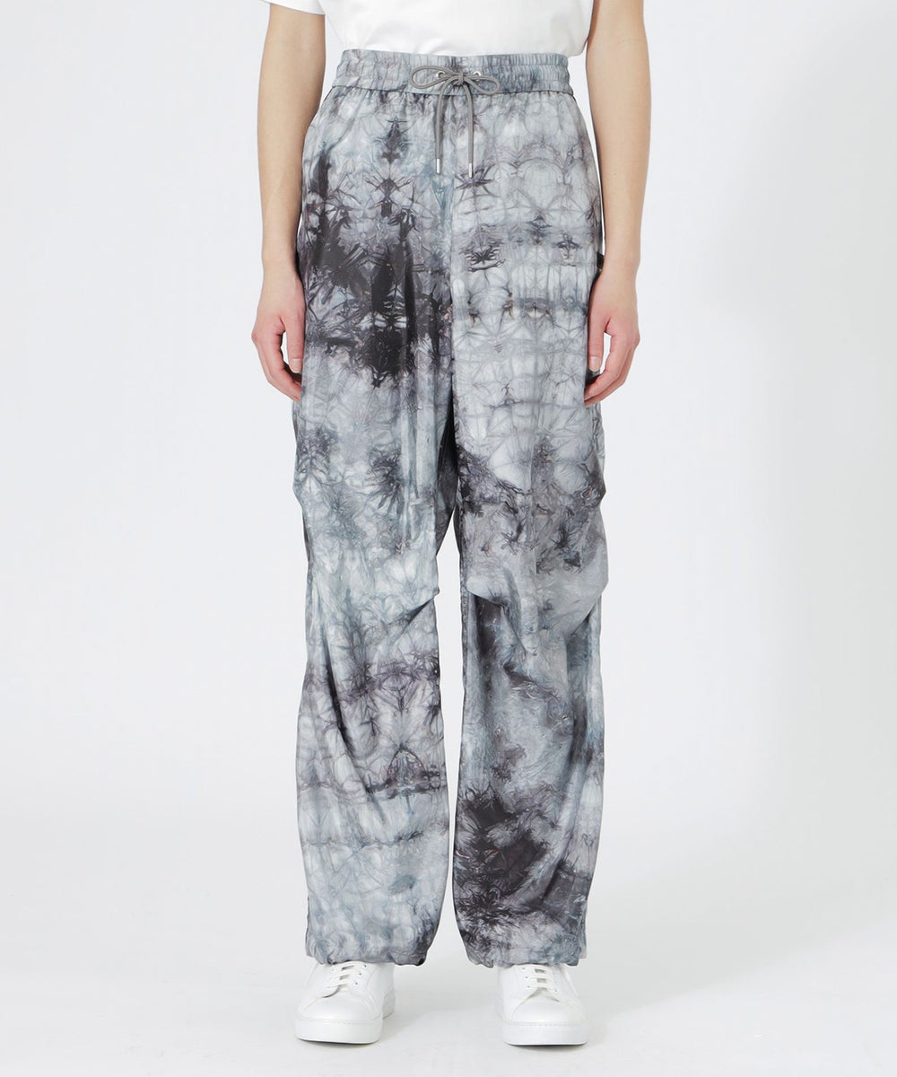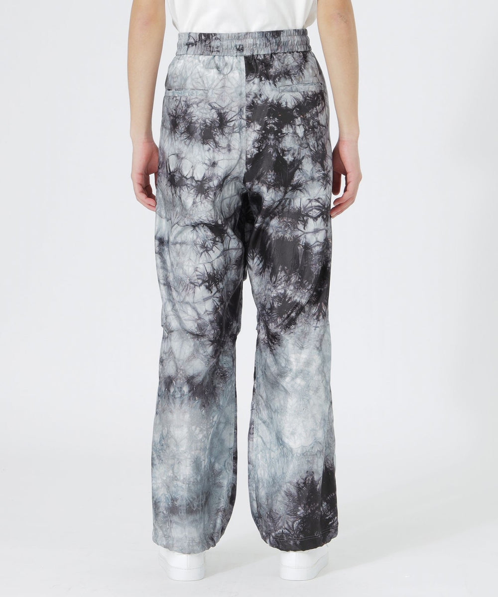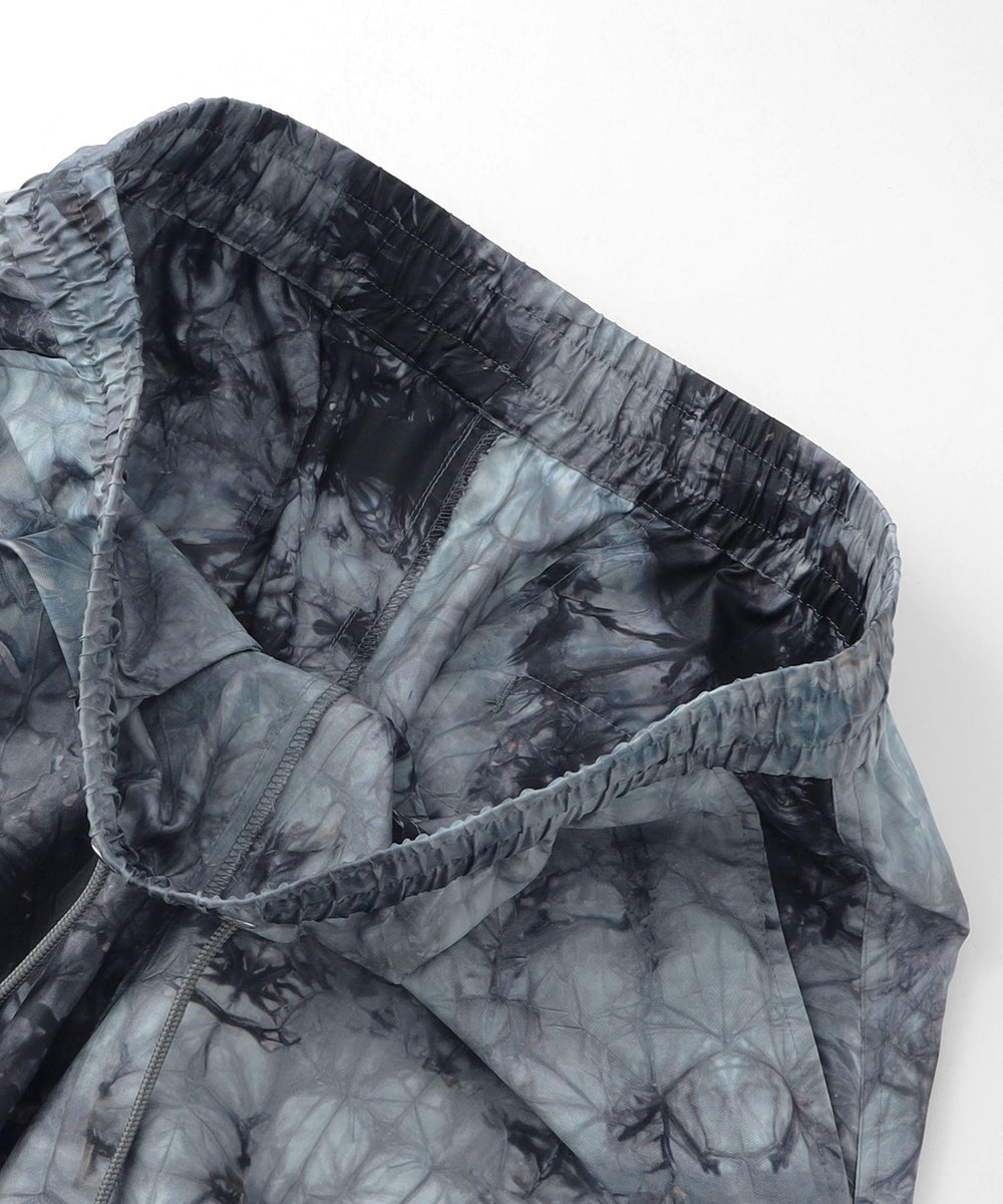 分散染料で染めたムラ染め柄が目を引くポリエステルタフタ素材を使用。