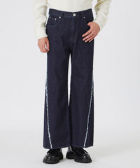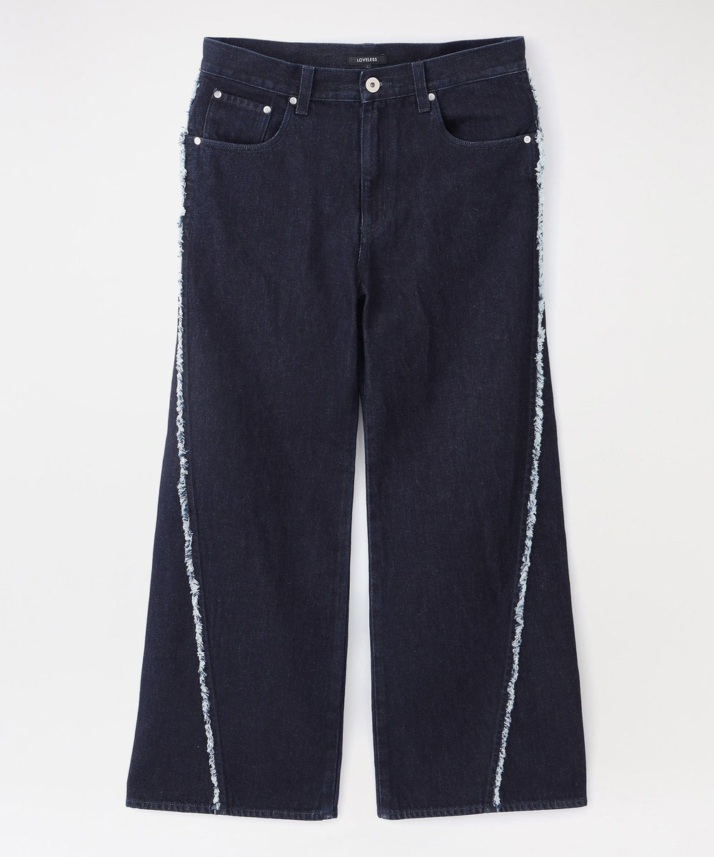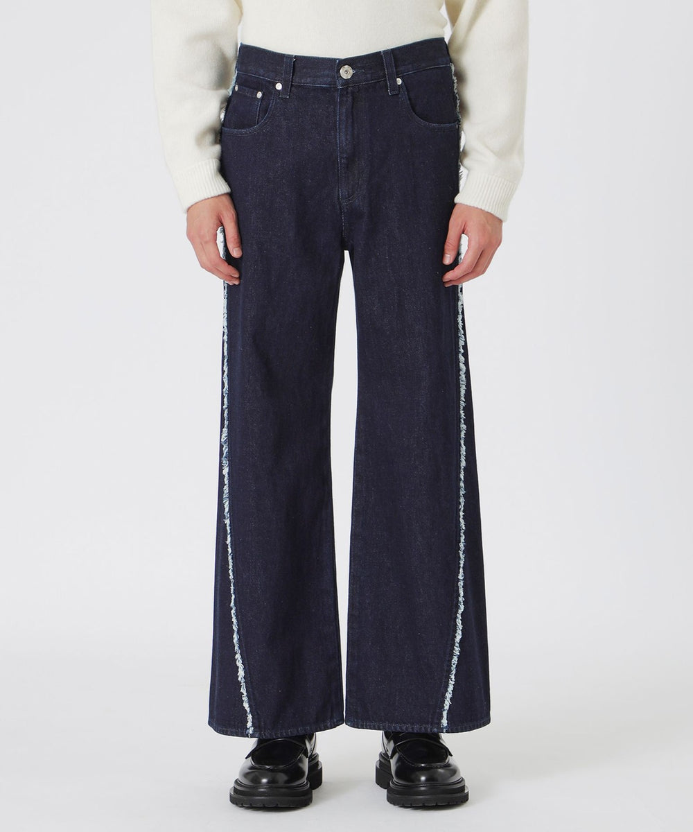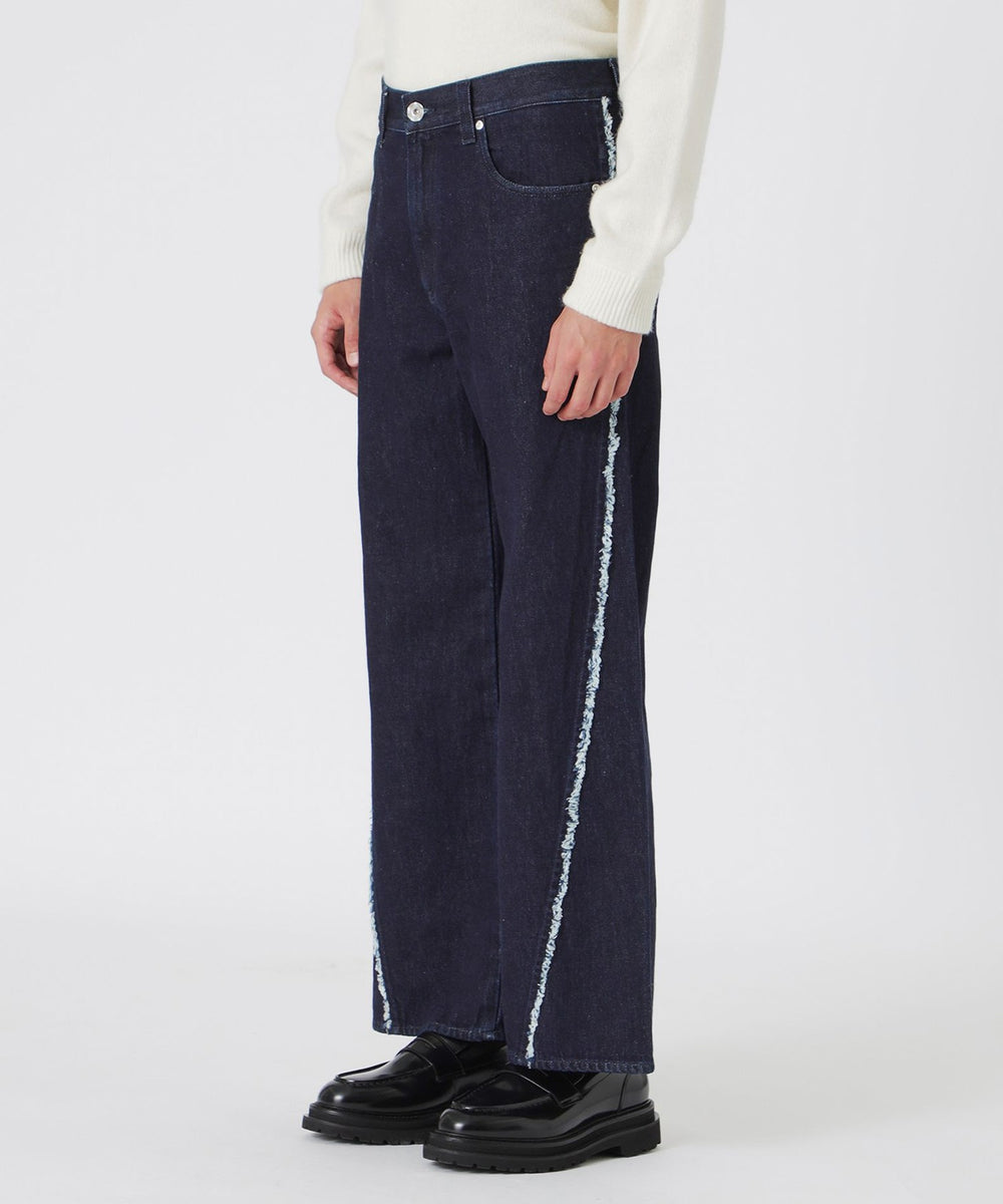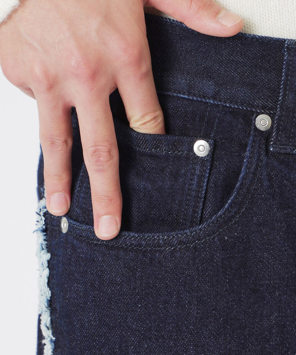 斜めに入った切り替えが目を引くワンウォッシュデニム