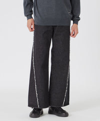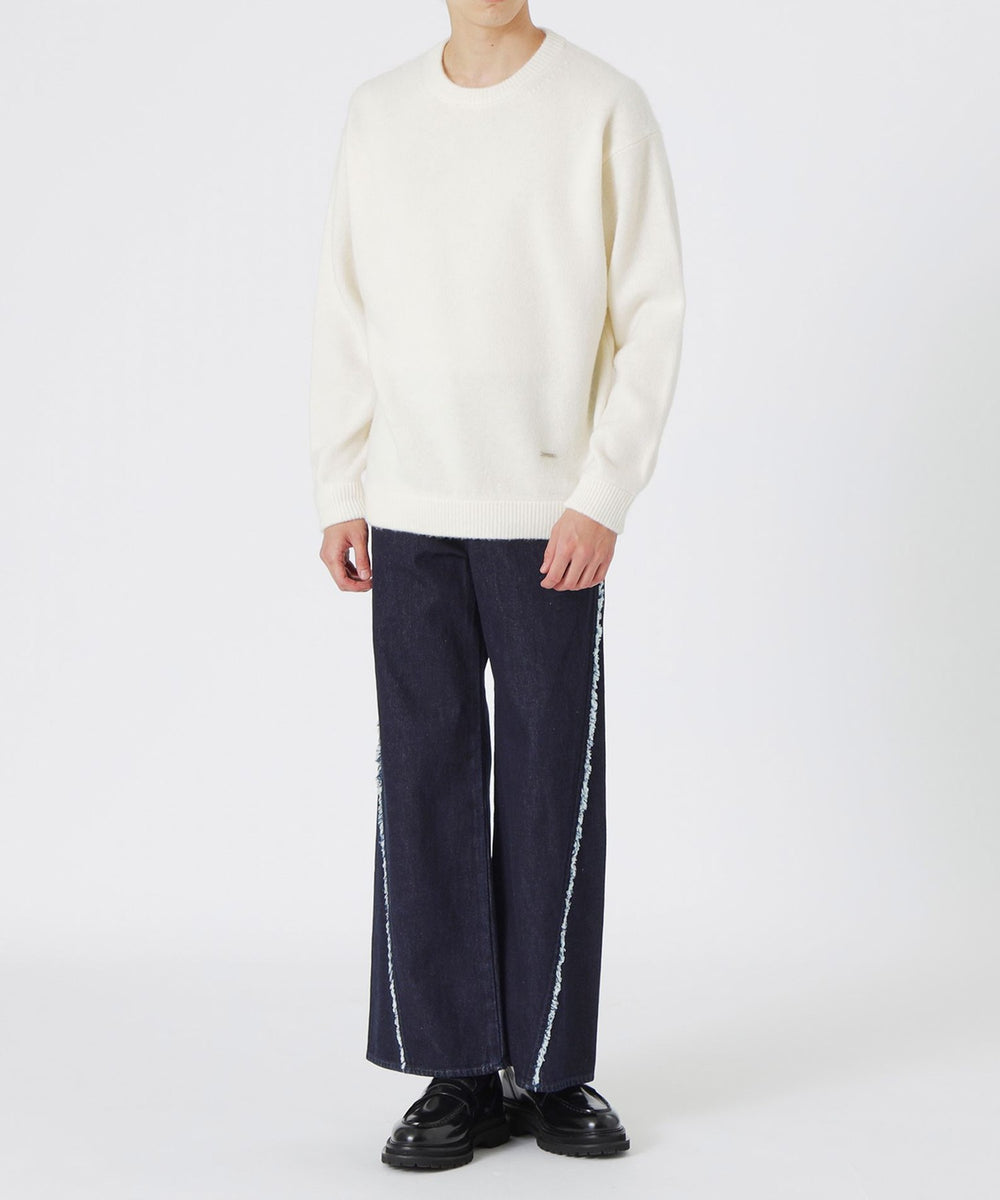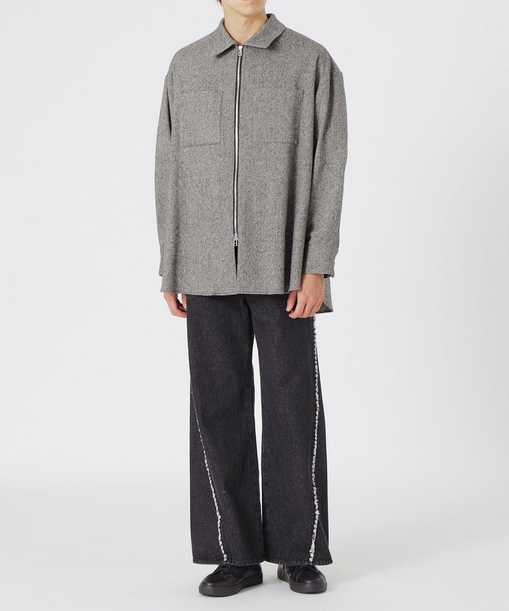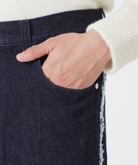 斜めに切り替えが入った構築的なデザインで、切り端にはほつれ加工を施しフリンジを残すことで程よいカジュアルさやこなれた印象に仕上げました。