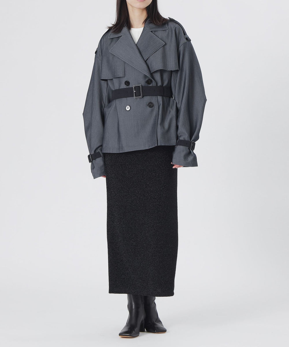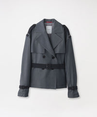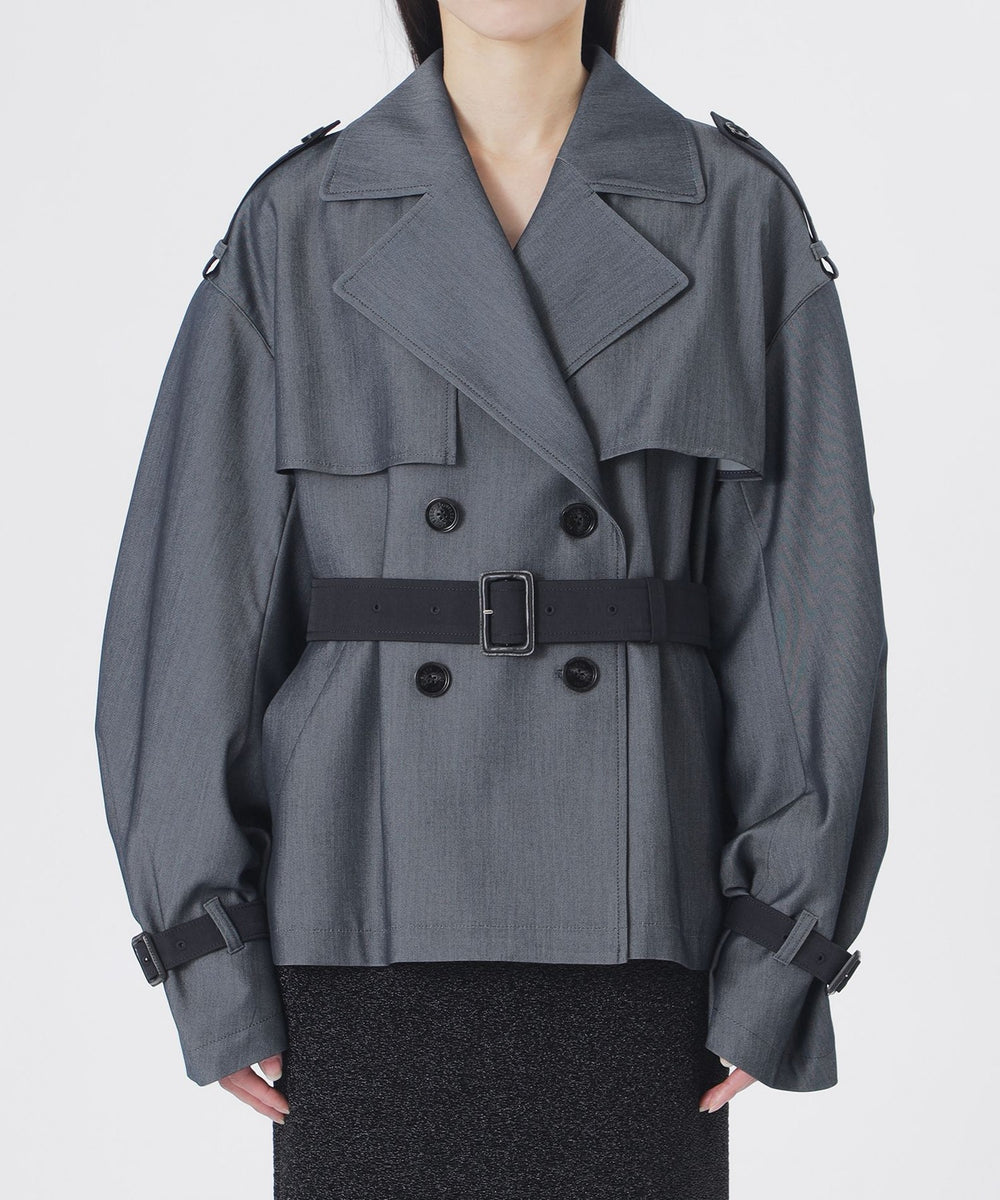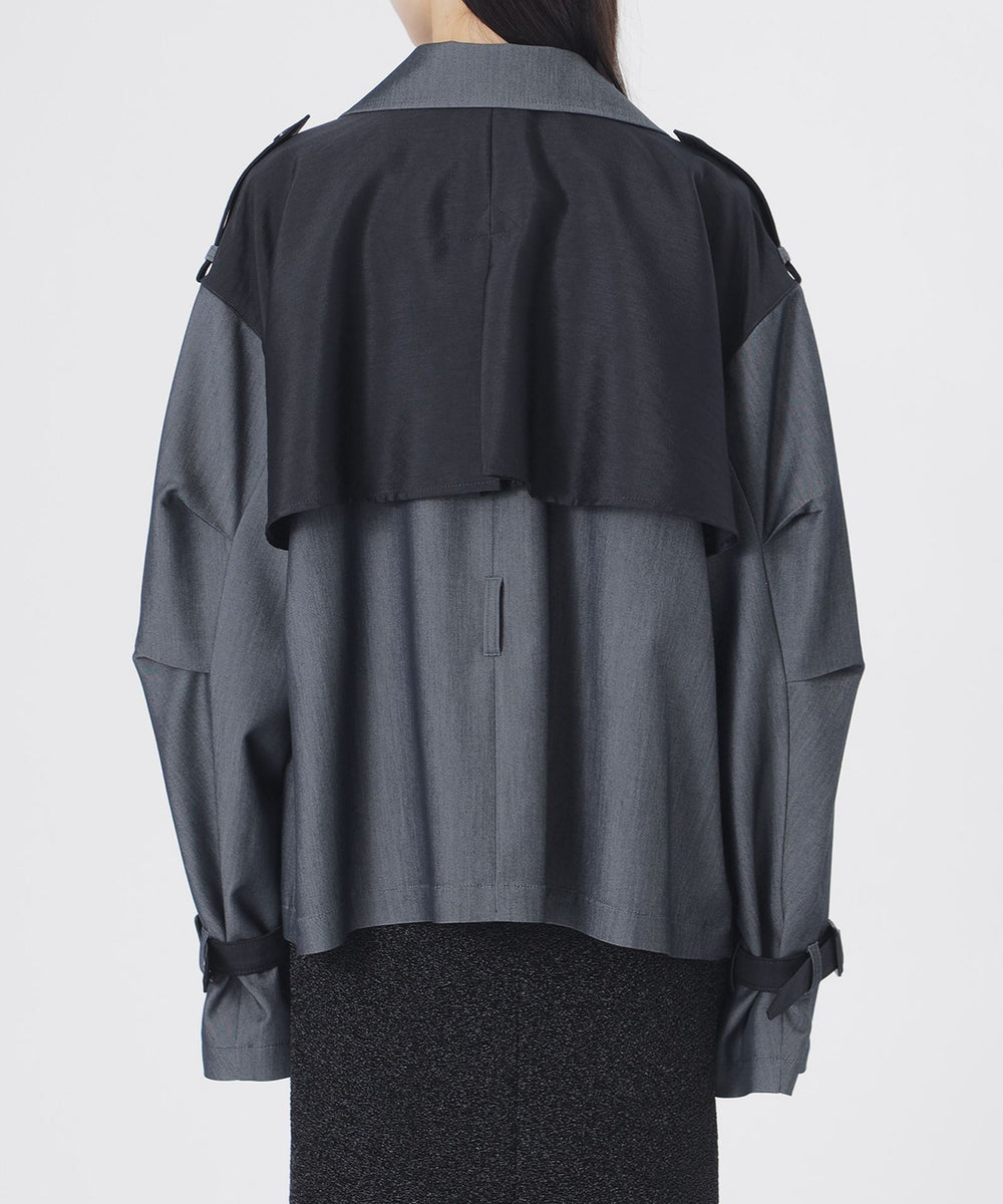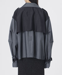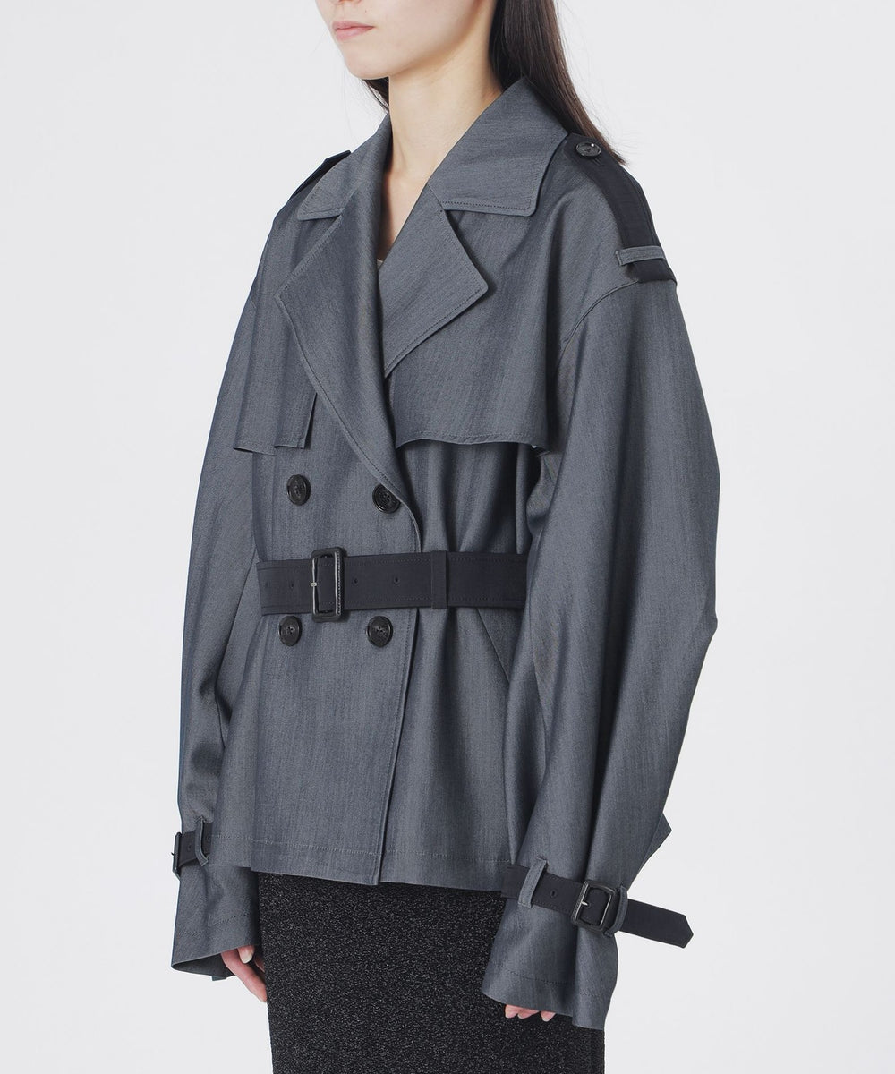 デニムトーンでブロッキングした、ゆったりサイズのショートトレンチコート