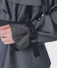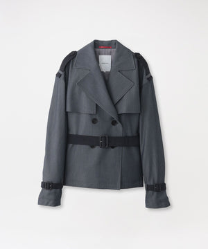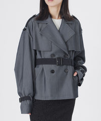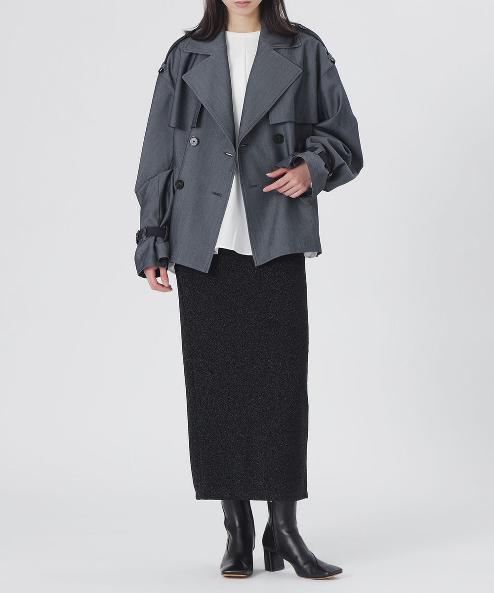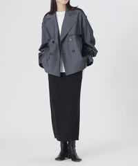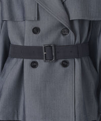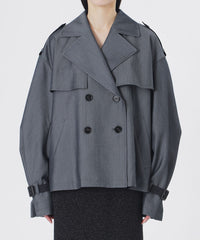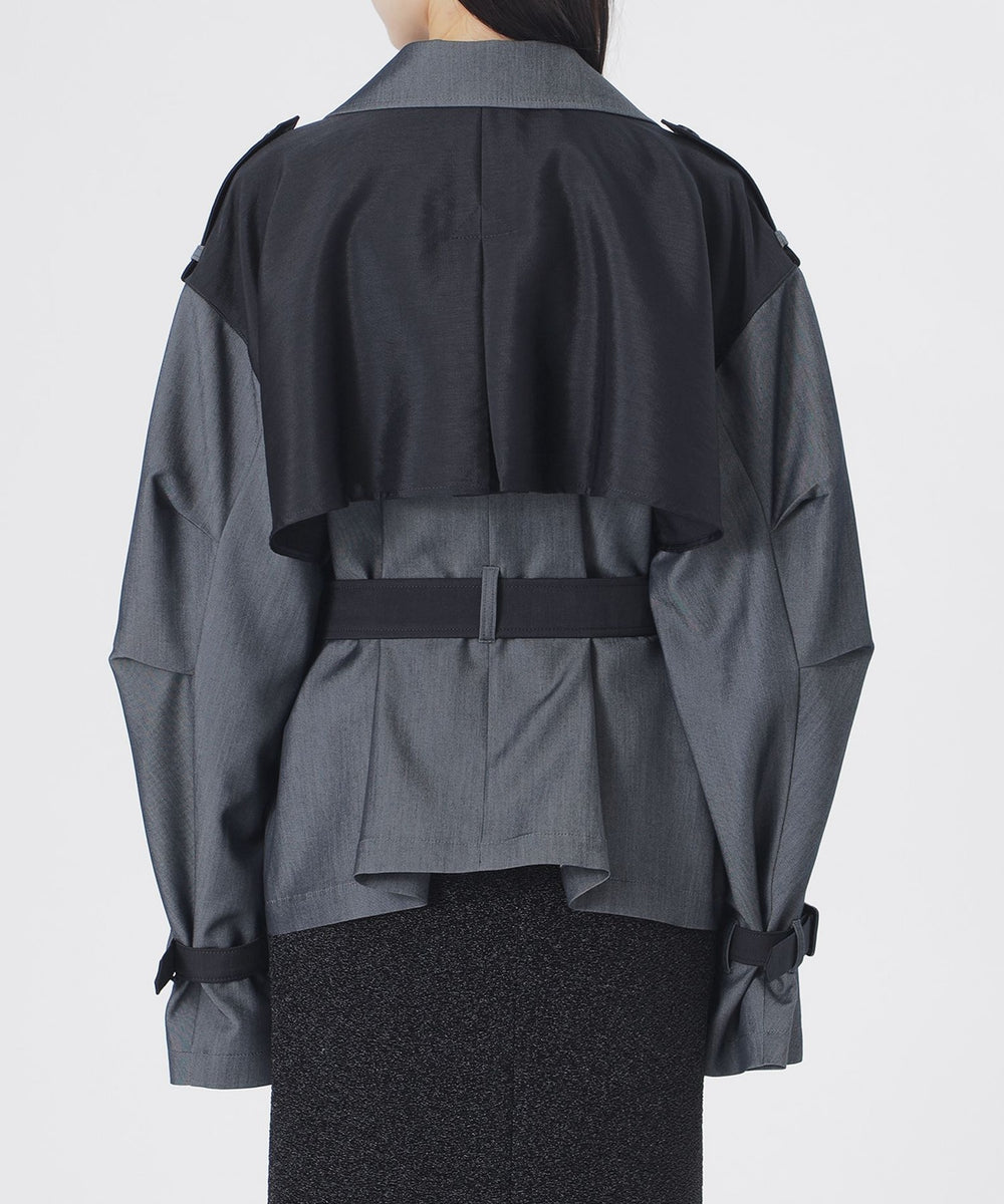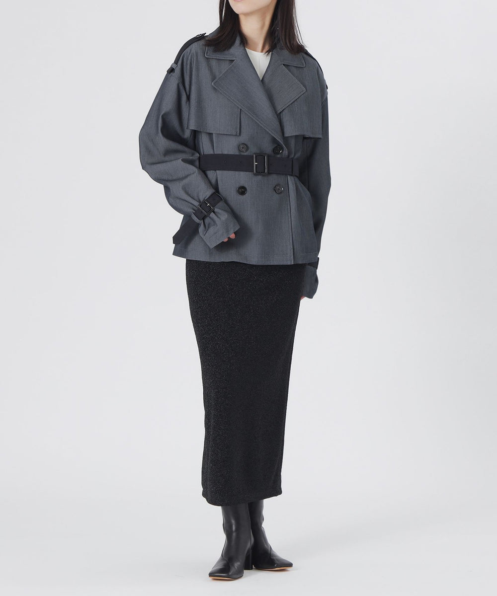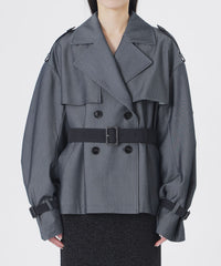 デニムトーンでブロッキングした、ゆったりサイズのショートトレンチコート