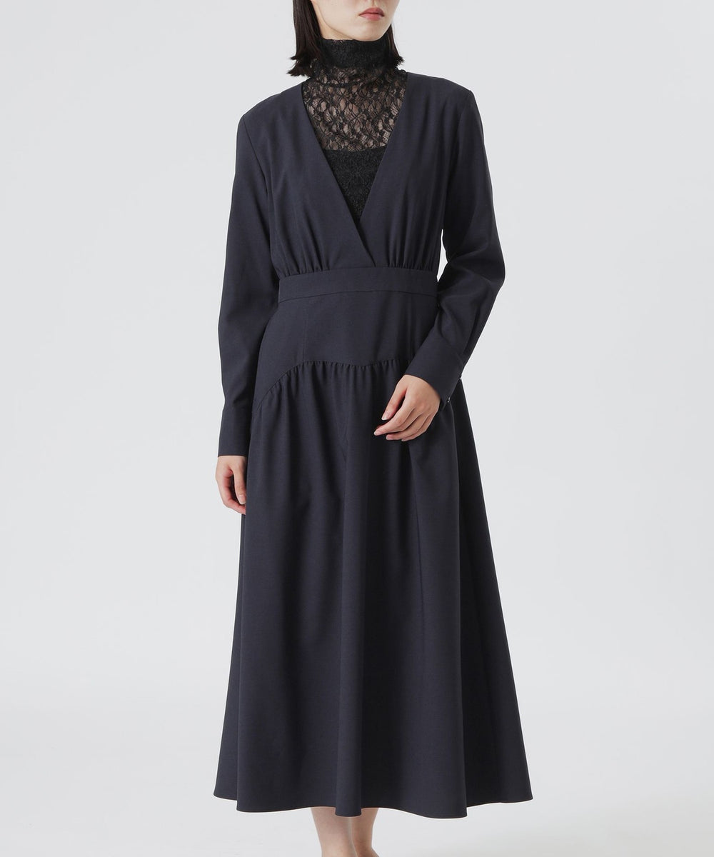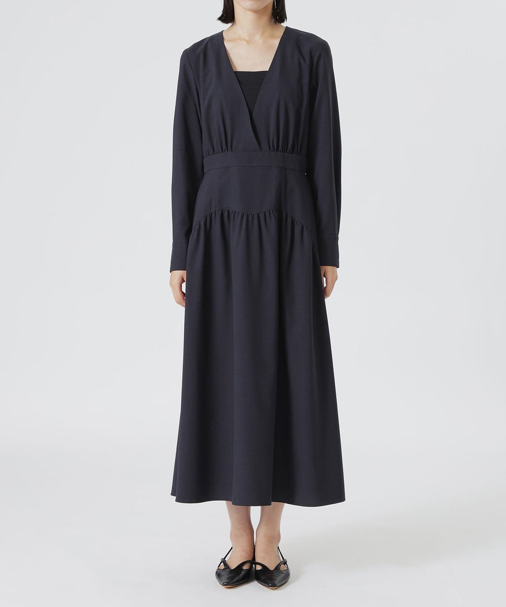 深Vカシュクールと高めウエストマークが洗練された印象を演出。