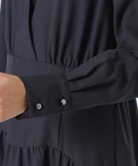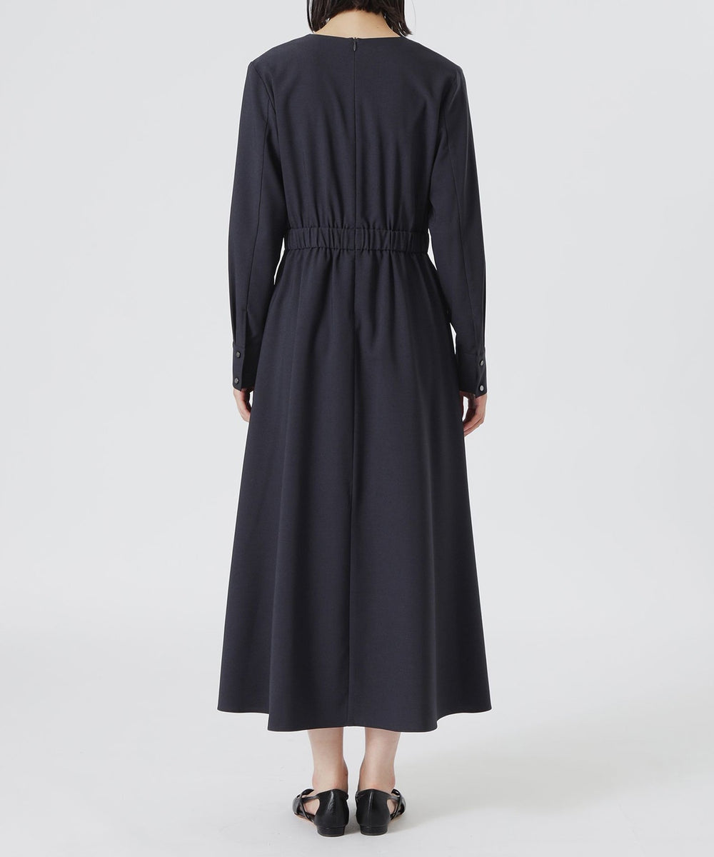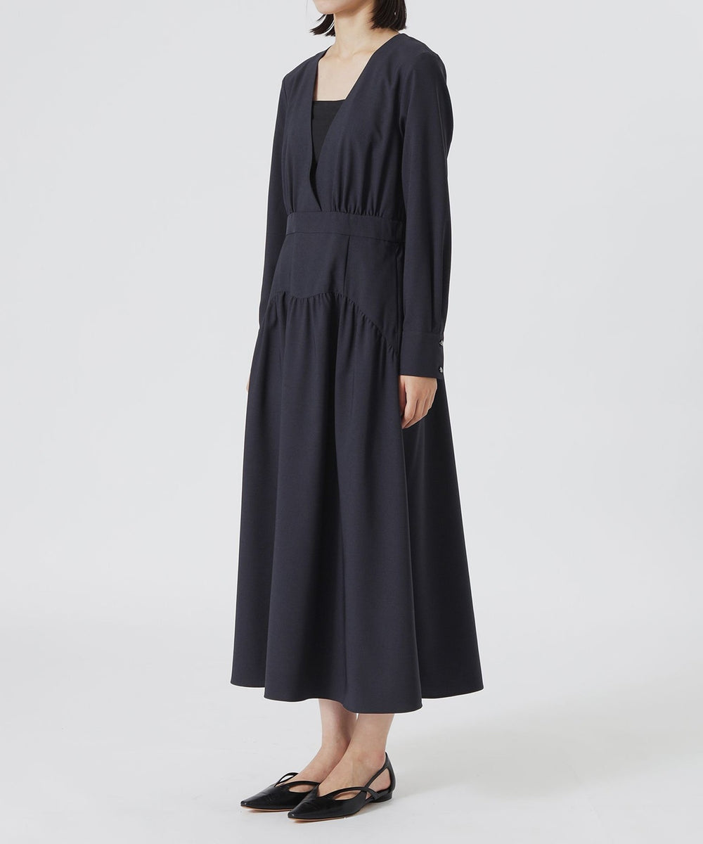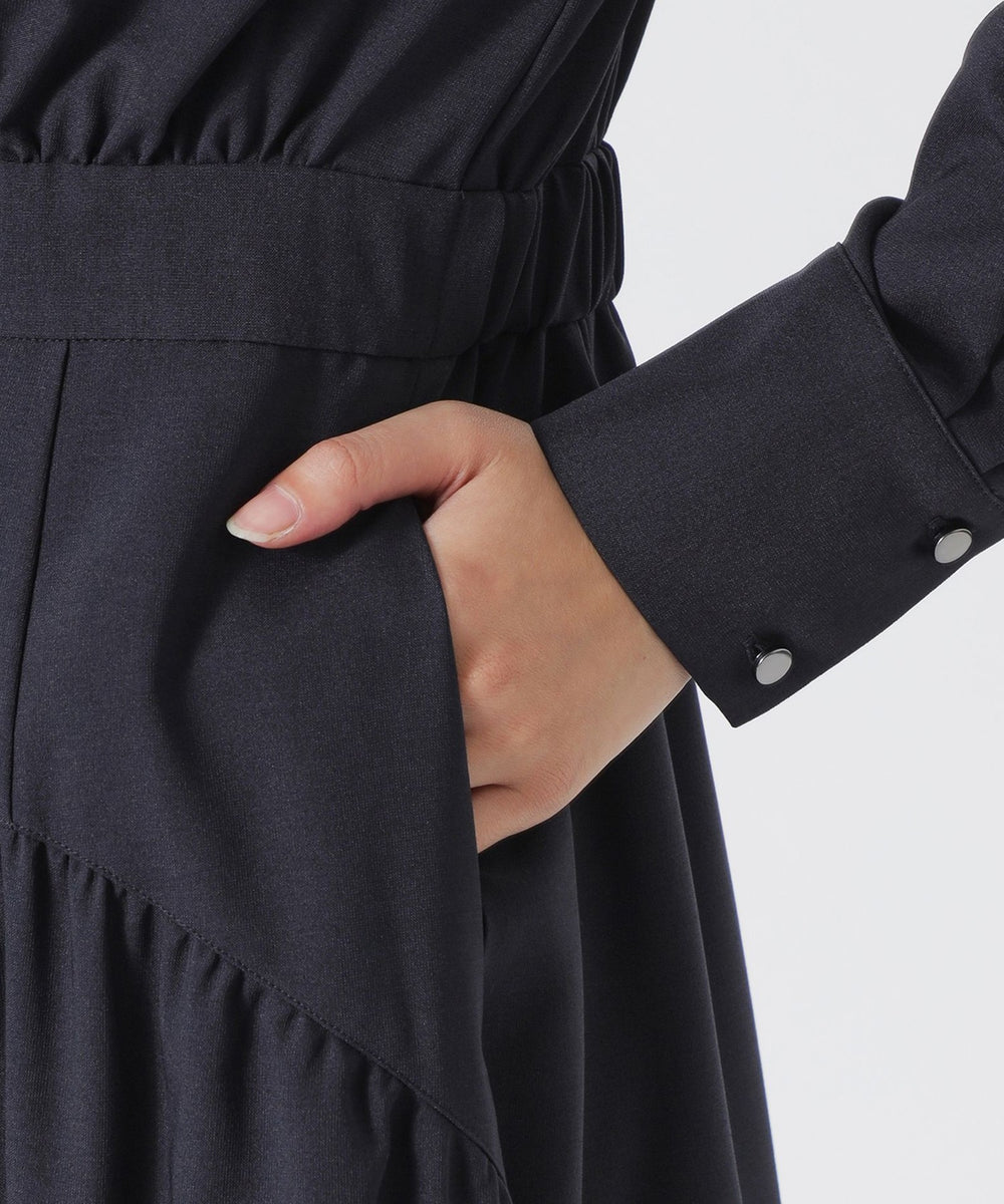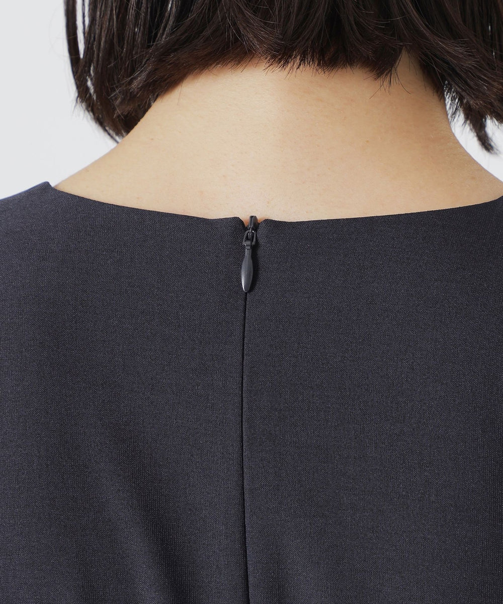 シャープな筒型袖とジグザグカットのボリュームスカートがモード感を際立たせ、後ろウエストのゴムギャザーで幅広い体型にフィットします。
