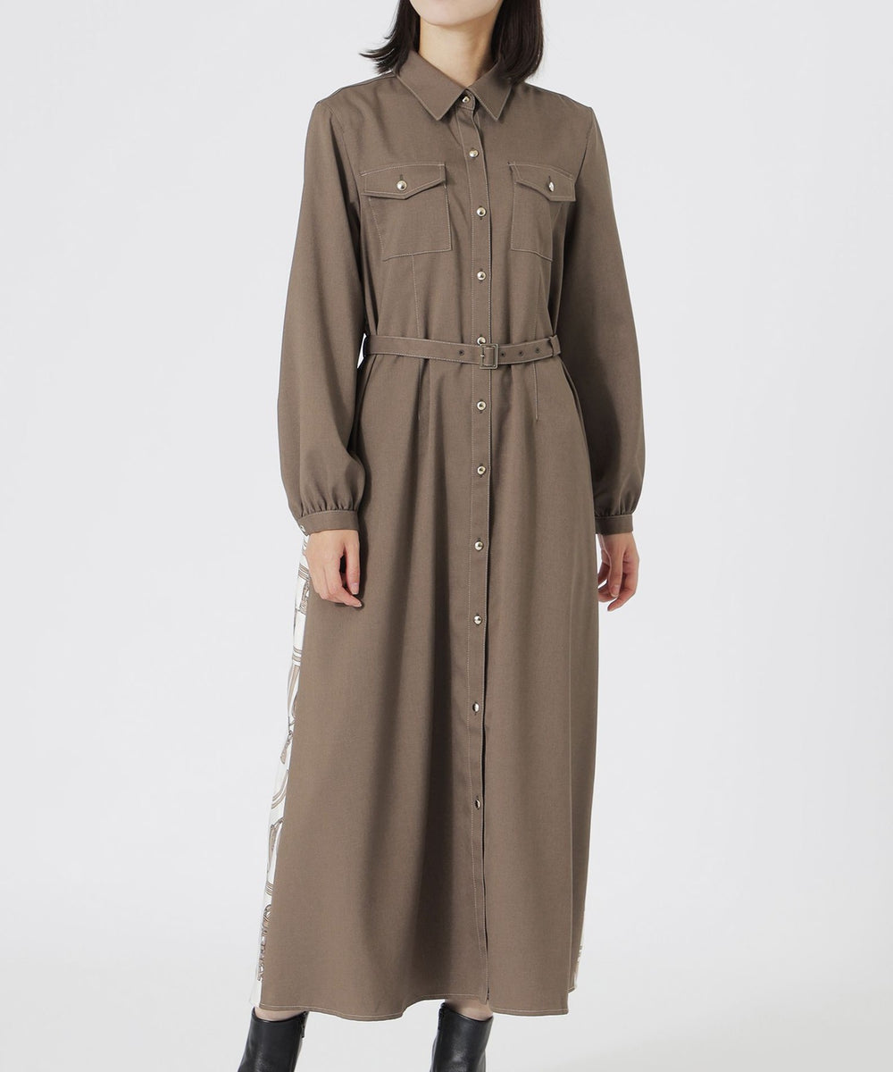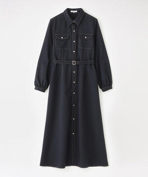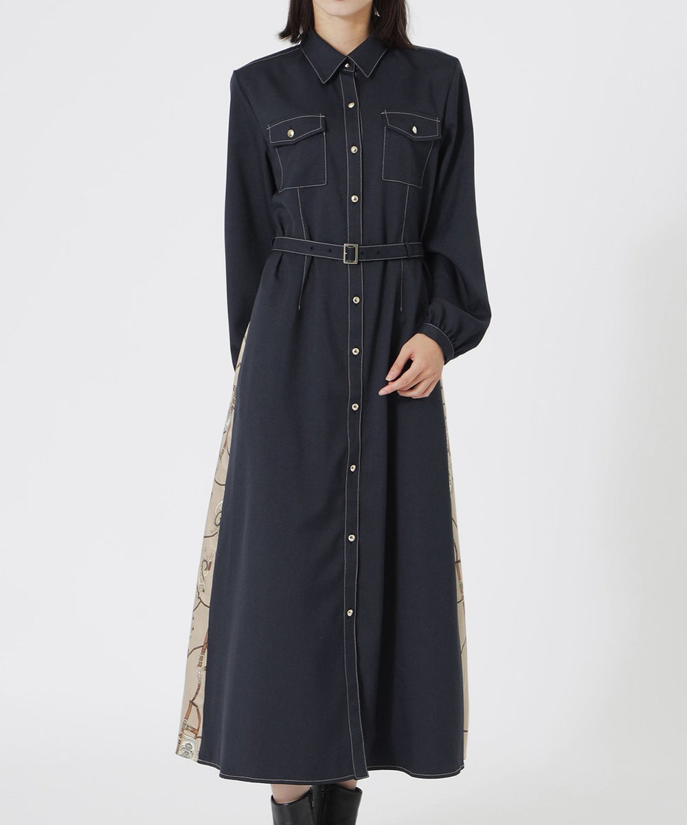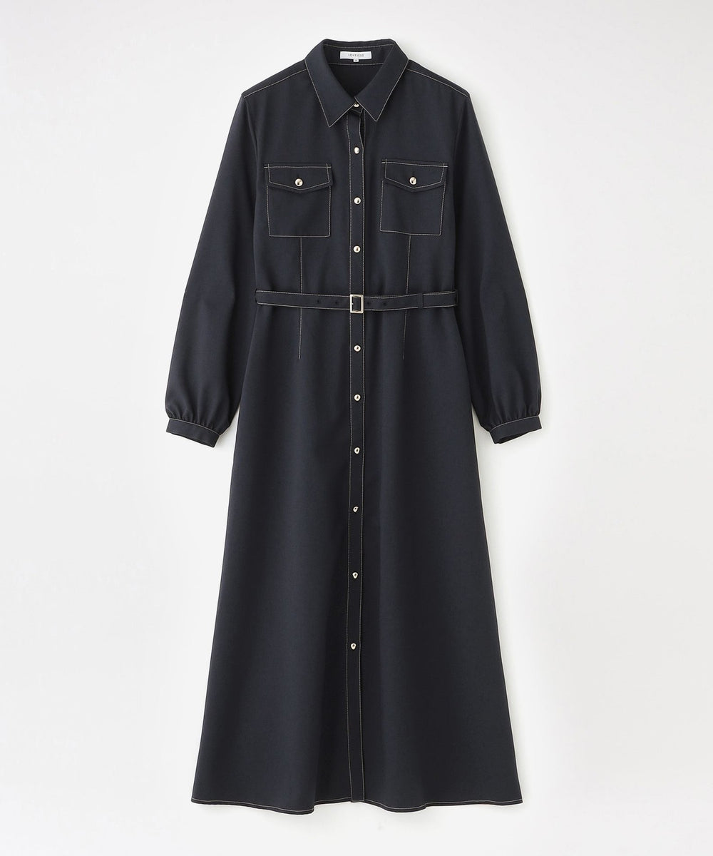 配色のステッチがアクセントになった、ブロッキングシャツカラードレス
