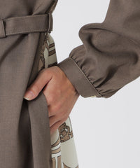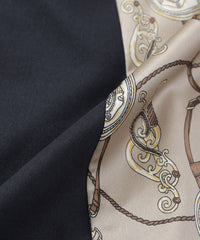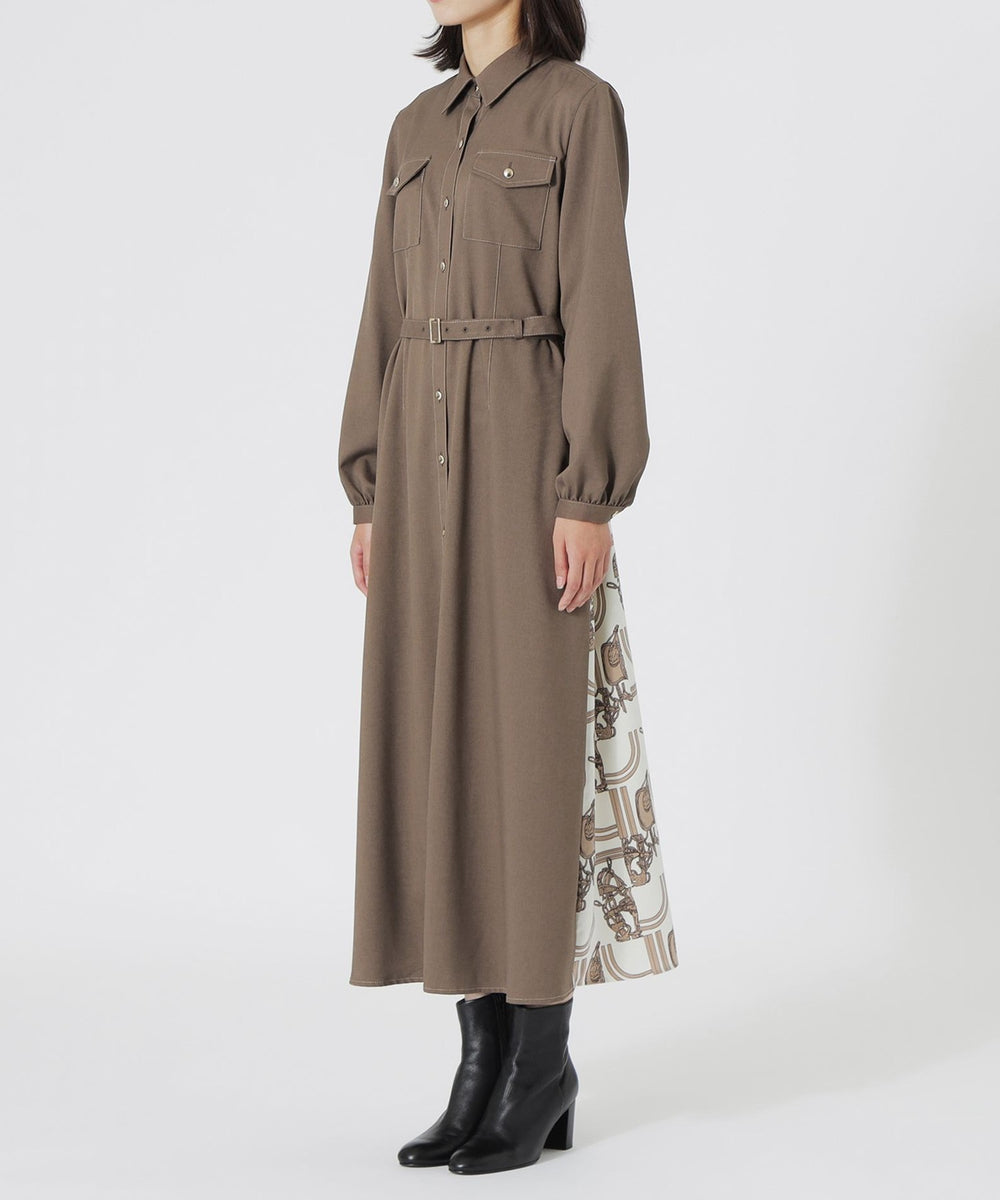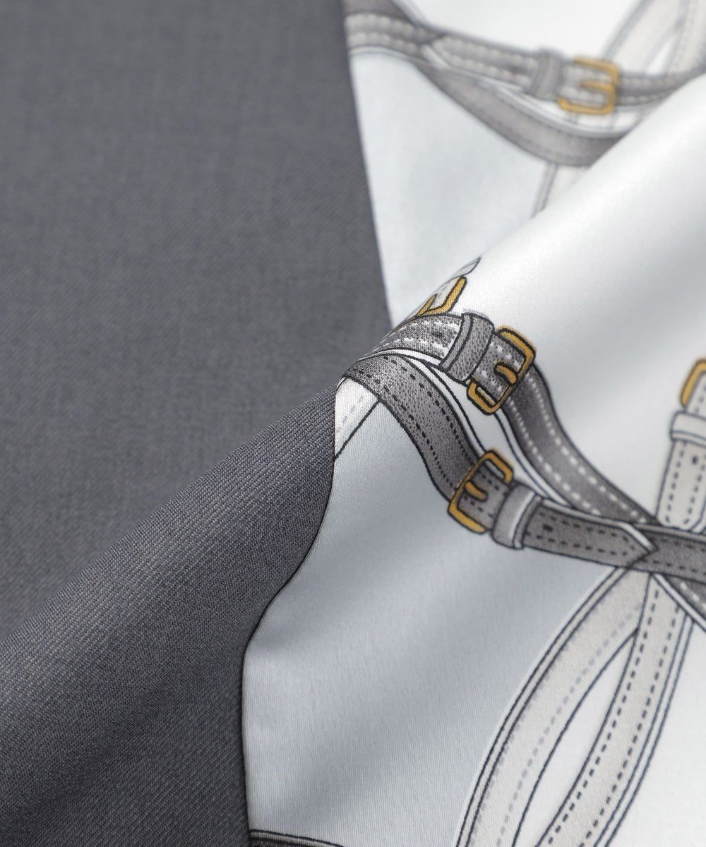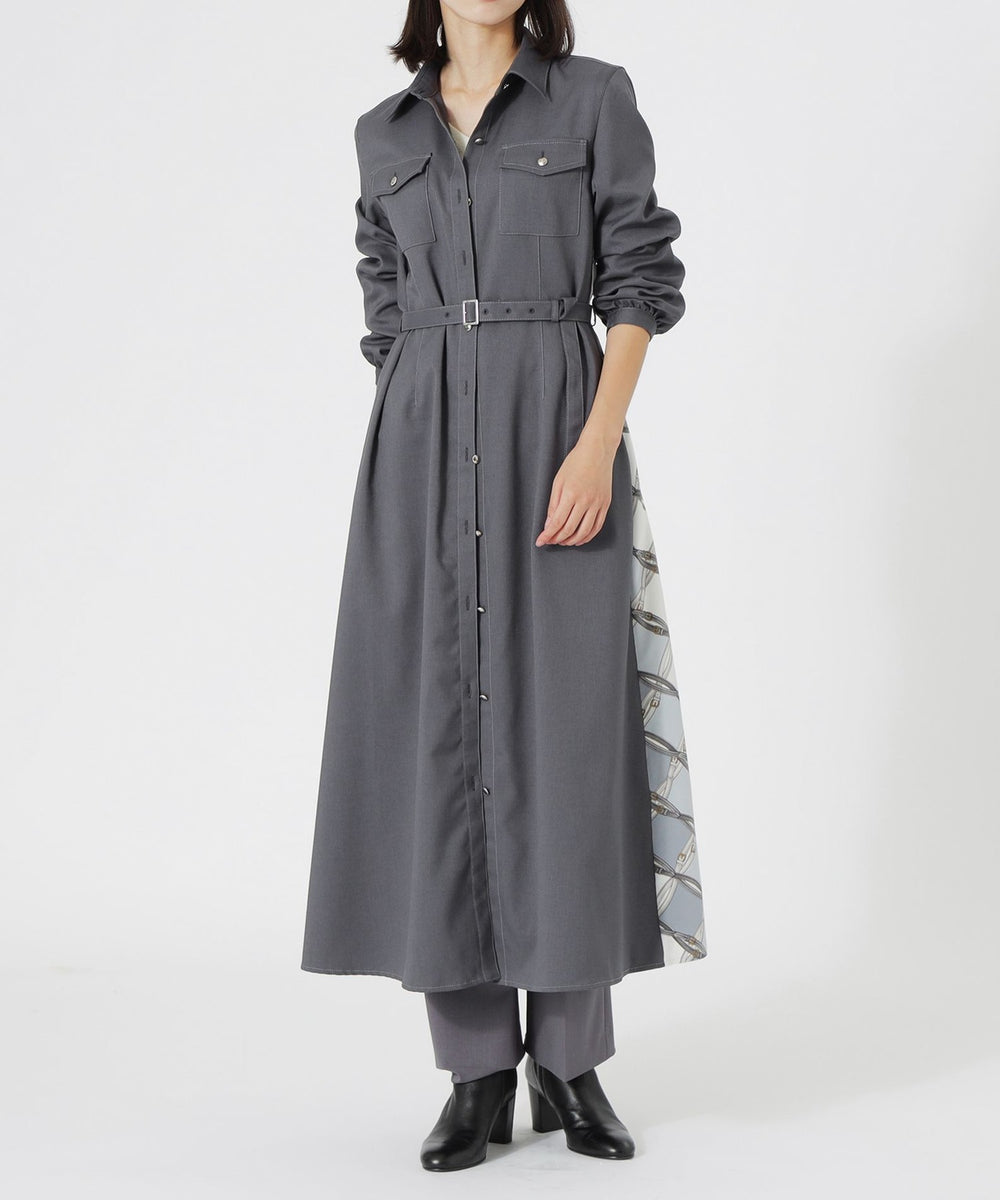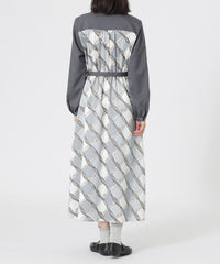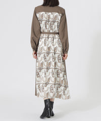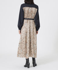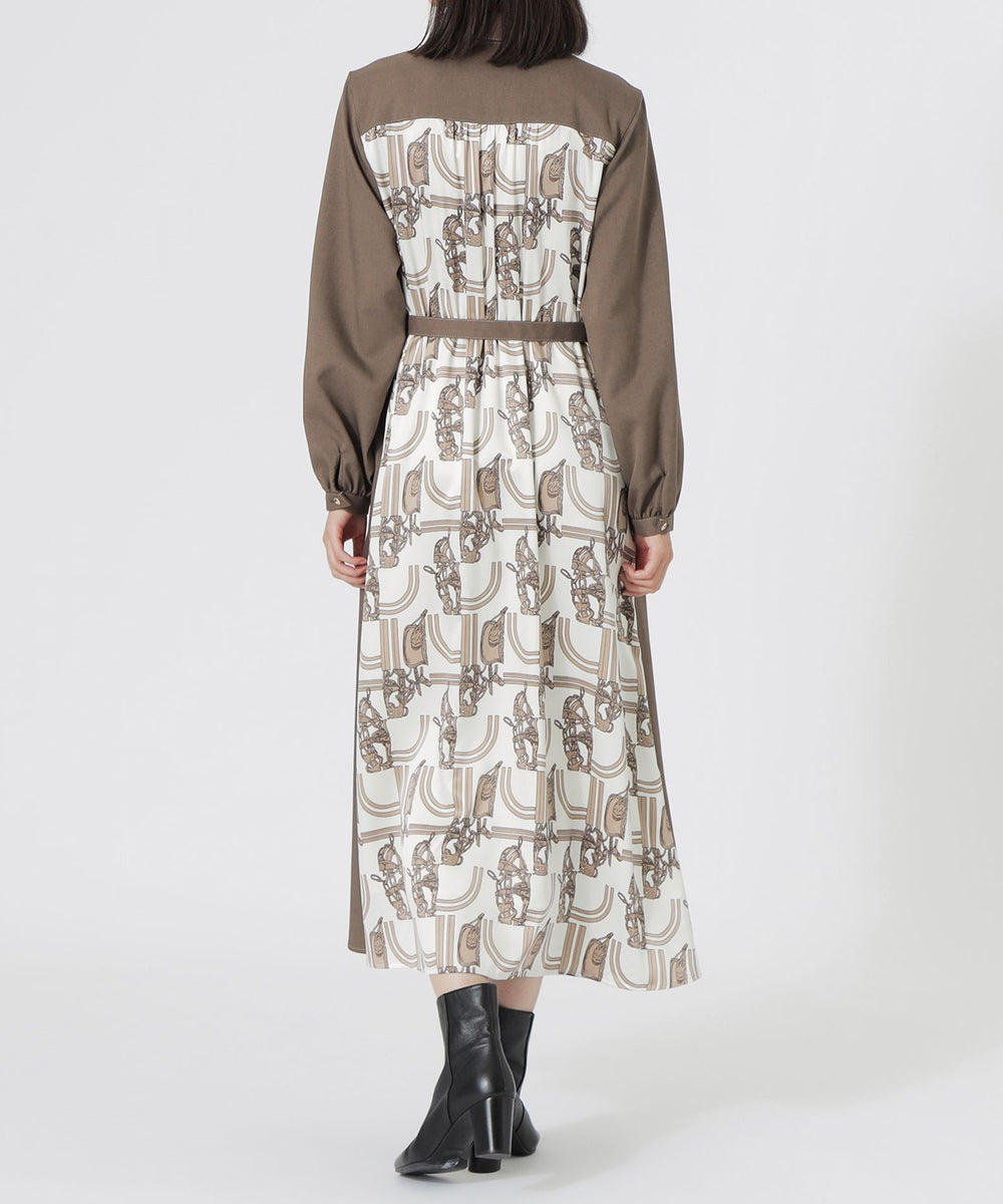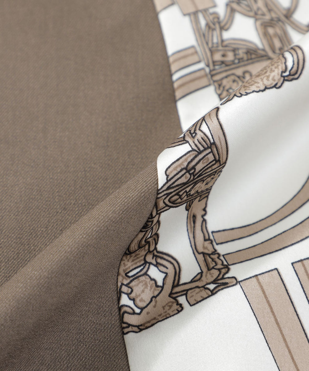 バックにはエレガントなスカーフ柄の生地をブロッキングし、存在感のある1着に。