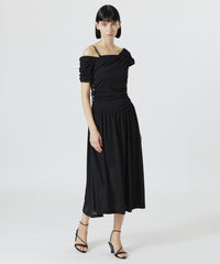 アシンメトリーにデザインされたネックにワンショルダーのスリーブがヘルシーな肌見せを演出。