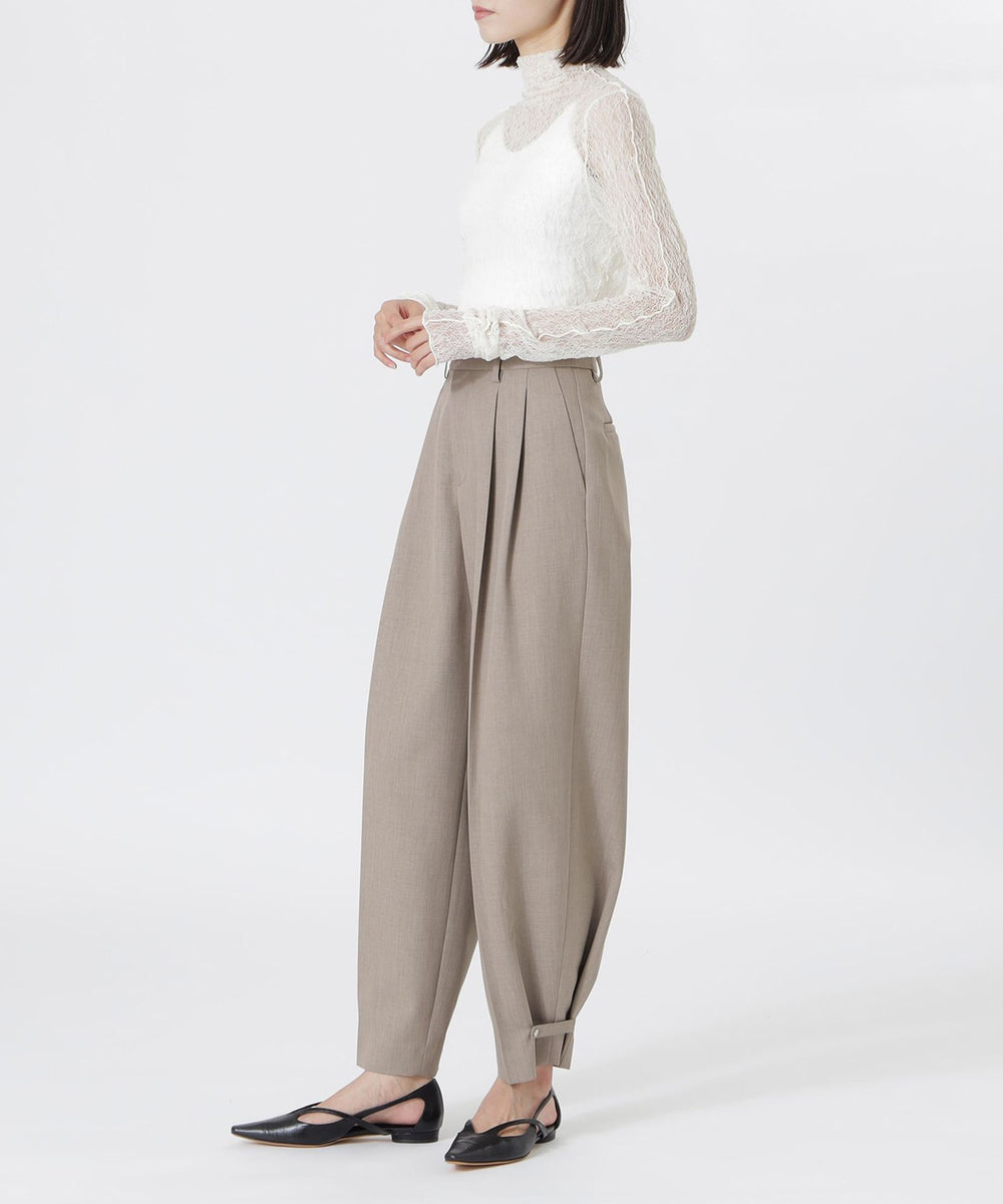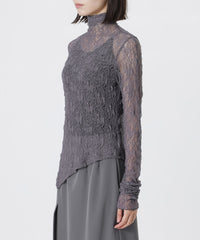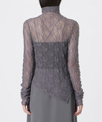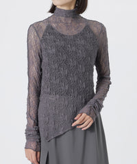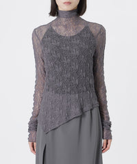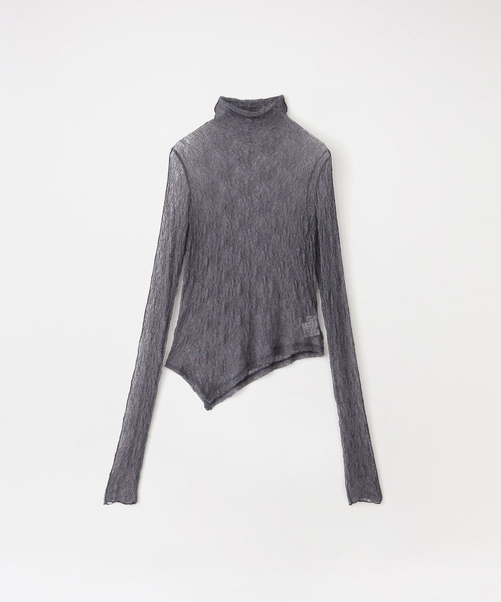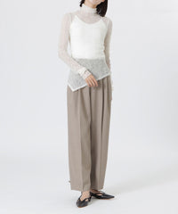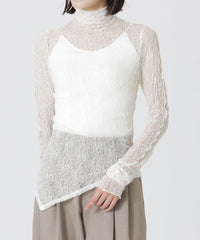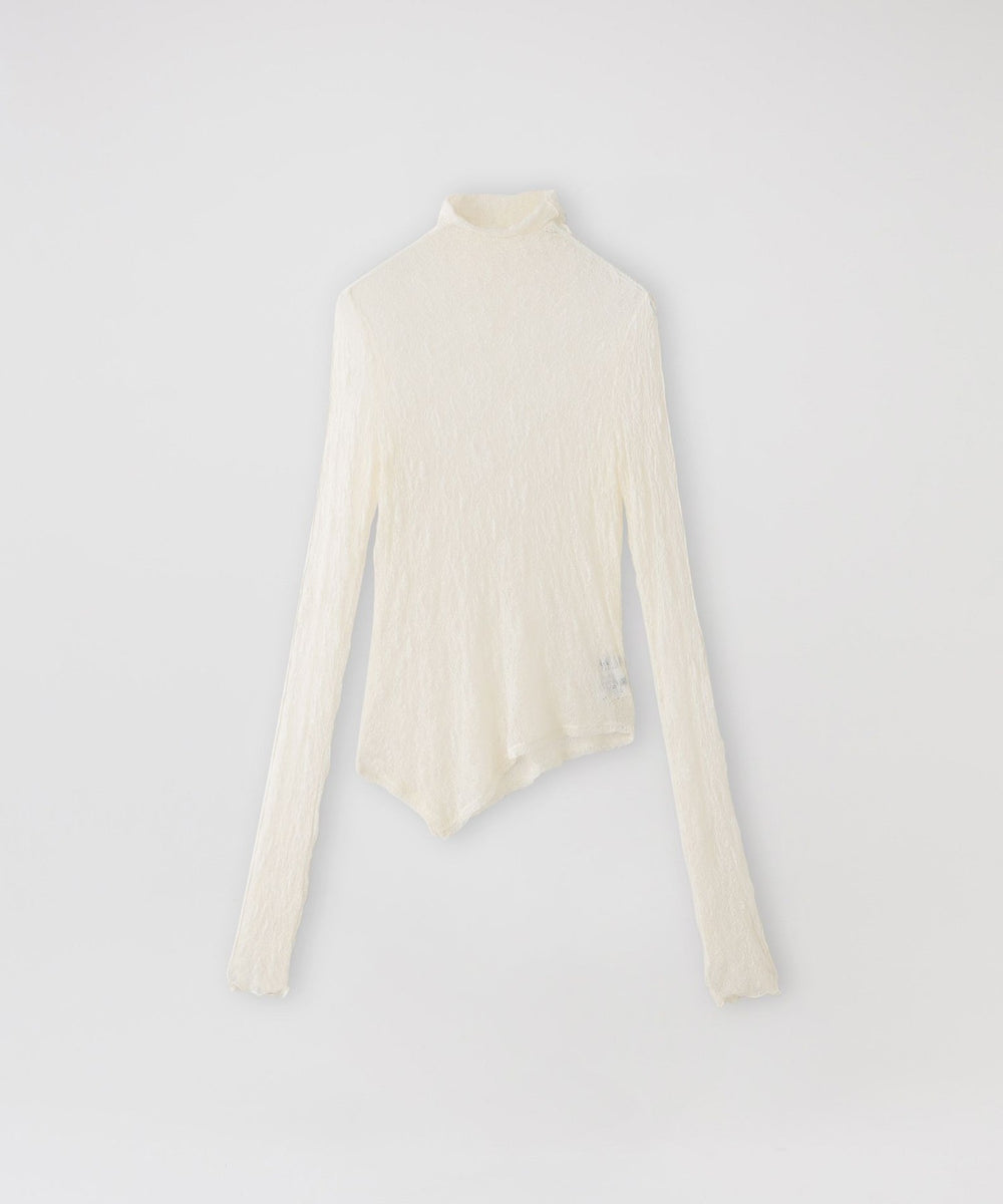 裾のアシンメトリーデザインを活かしたトップスとしては、タイトなハイウエストボトムと合わせて洗練されたモード感を。インナー使いなら、ジャケットやクロップドシャツのレイヤードで繊細な透け感とこなれた奥行きをプラスするのがおすすめです。
