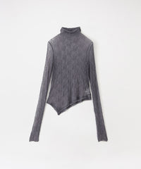 デザインは、ネックラインを引き締めるハイネックと、アシンメトリーにカットされた裾のラインが印象的。