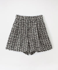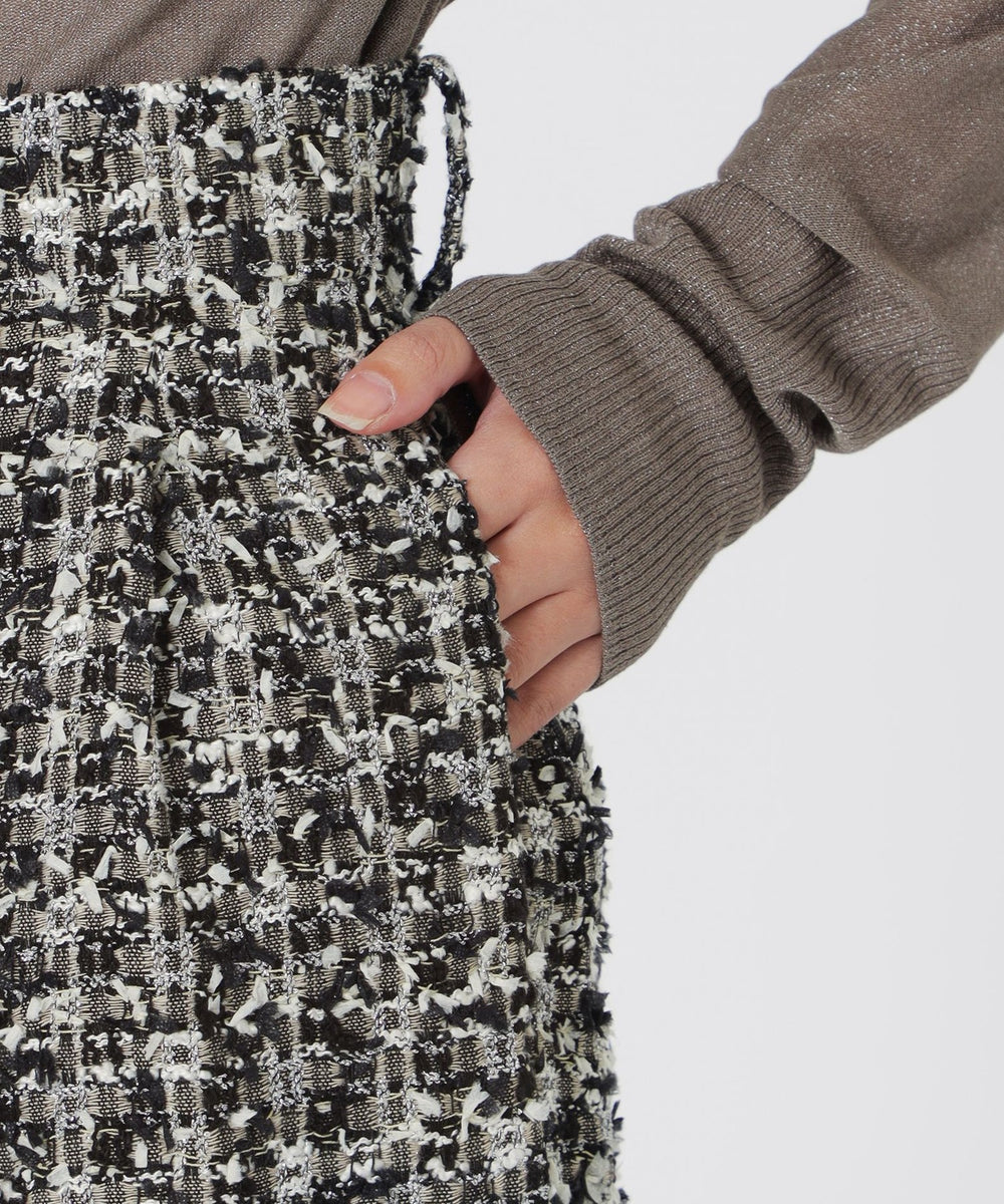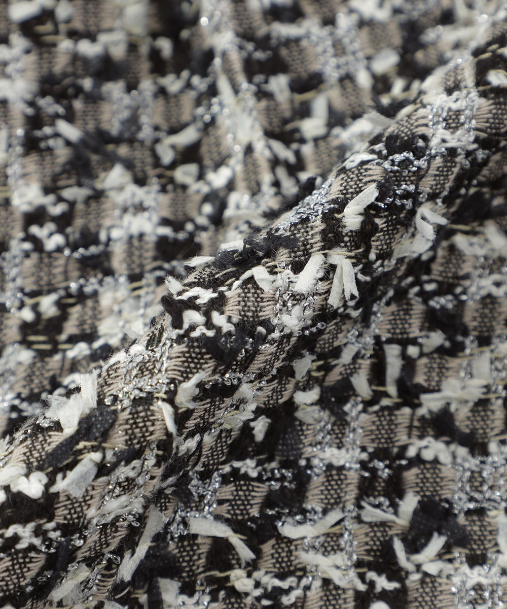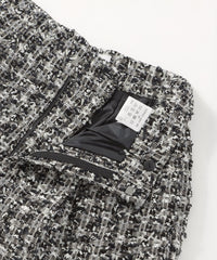 リボンヤーンやラメ糸をふんだんに織り込んだ、華やかな表情のファンシーツイードを使用。
