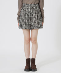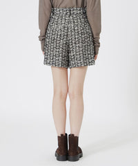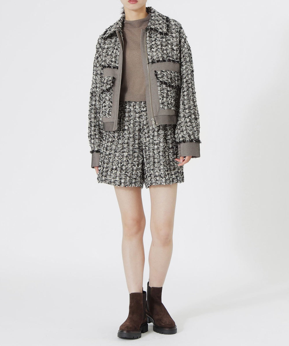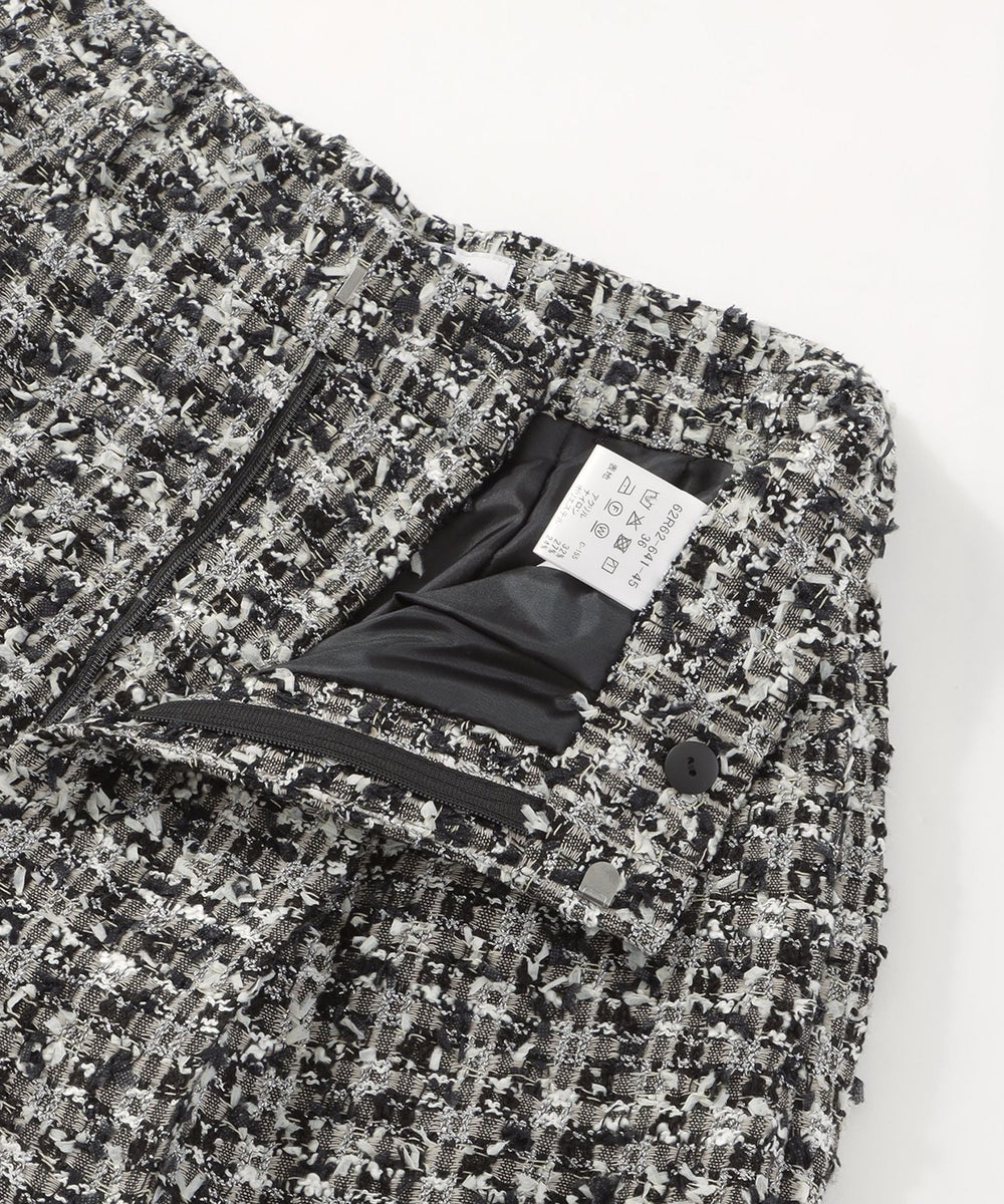 フロントに施した2タックが生み出す立体感が、ふんわりとした美しいシルエットを引き立てます。重厚感のあるツイード素材でも軽やかに着られる、絶妙な分量感が魅力。短すぎない着丈で大人も取り入れやすく、クラシックを今のバランスで楽しめる一着です。