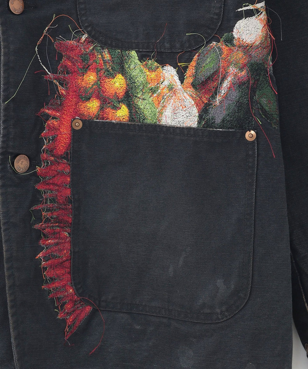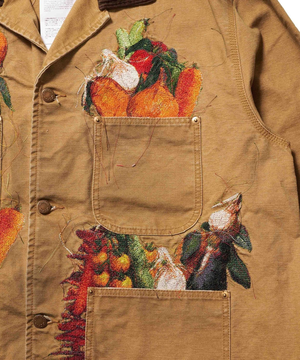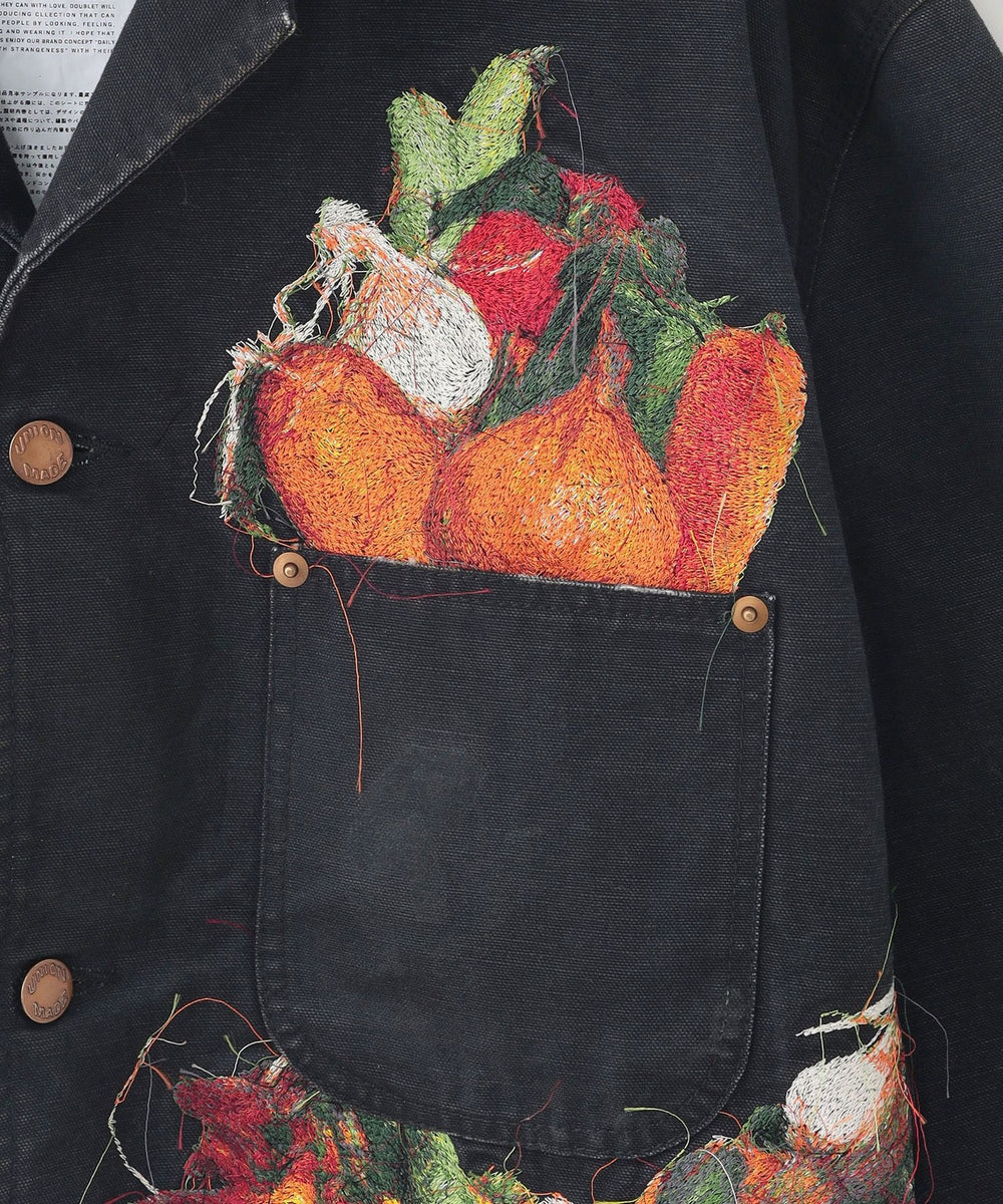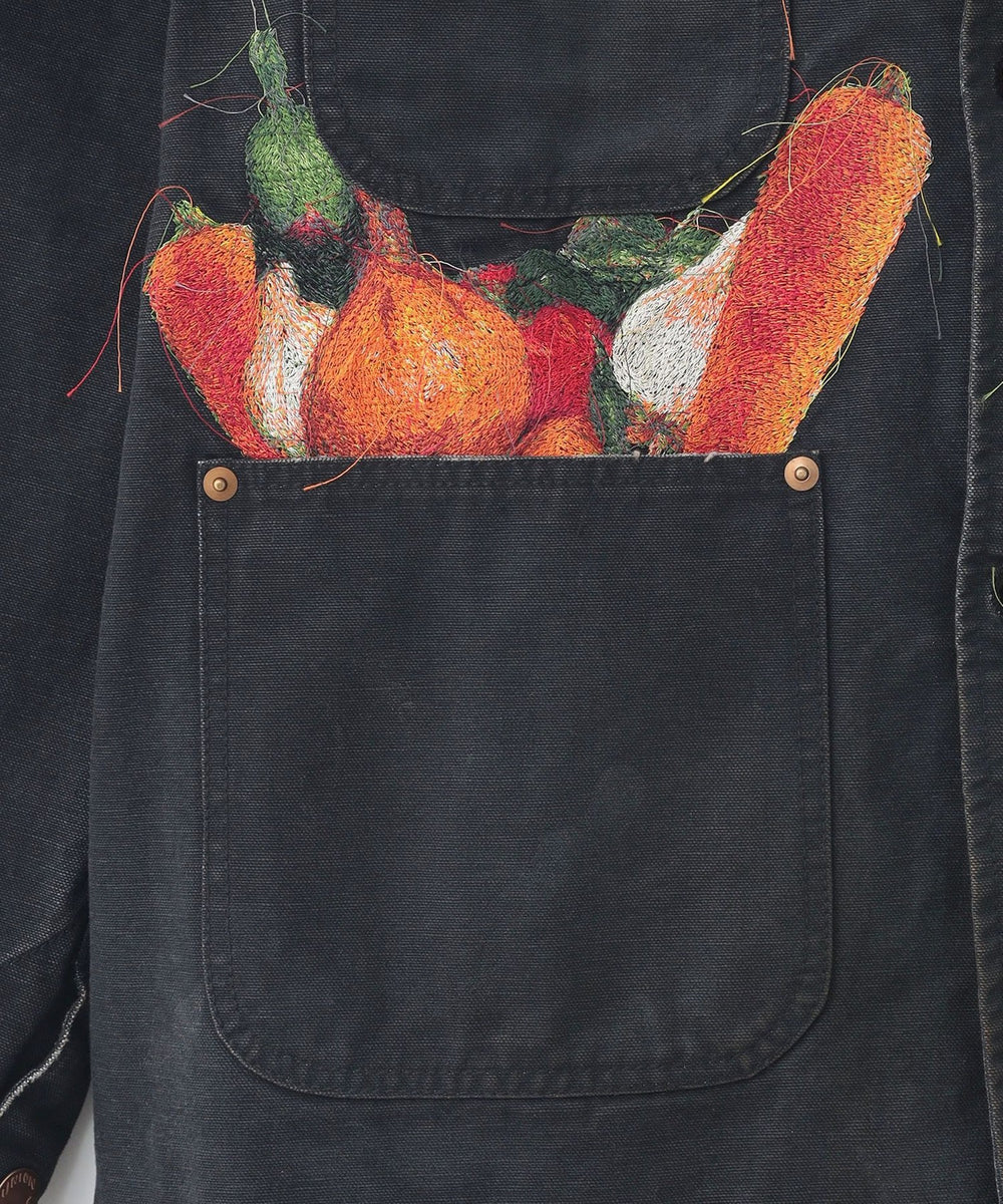 製品染めと洗いをかけたダック生地に、玉ねぎ、人参、ピーマン、にんにく、赤唐辛子、茄子などの野菜をリアルな刺繍で施したワークジャケット。