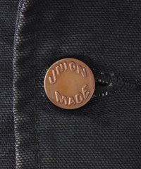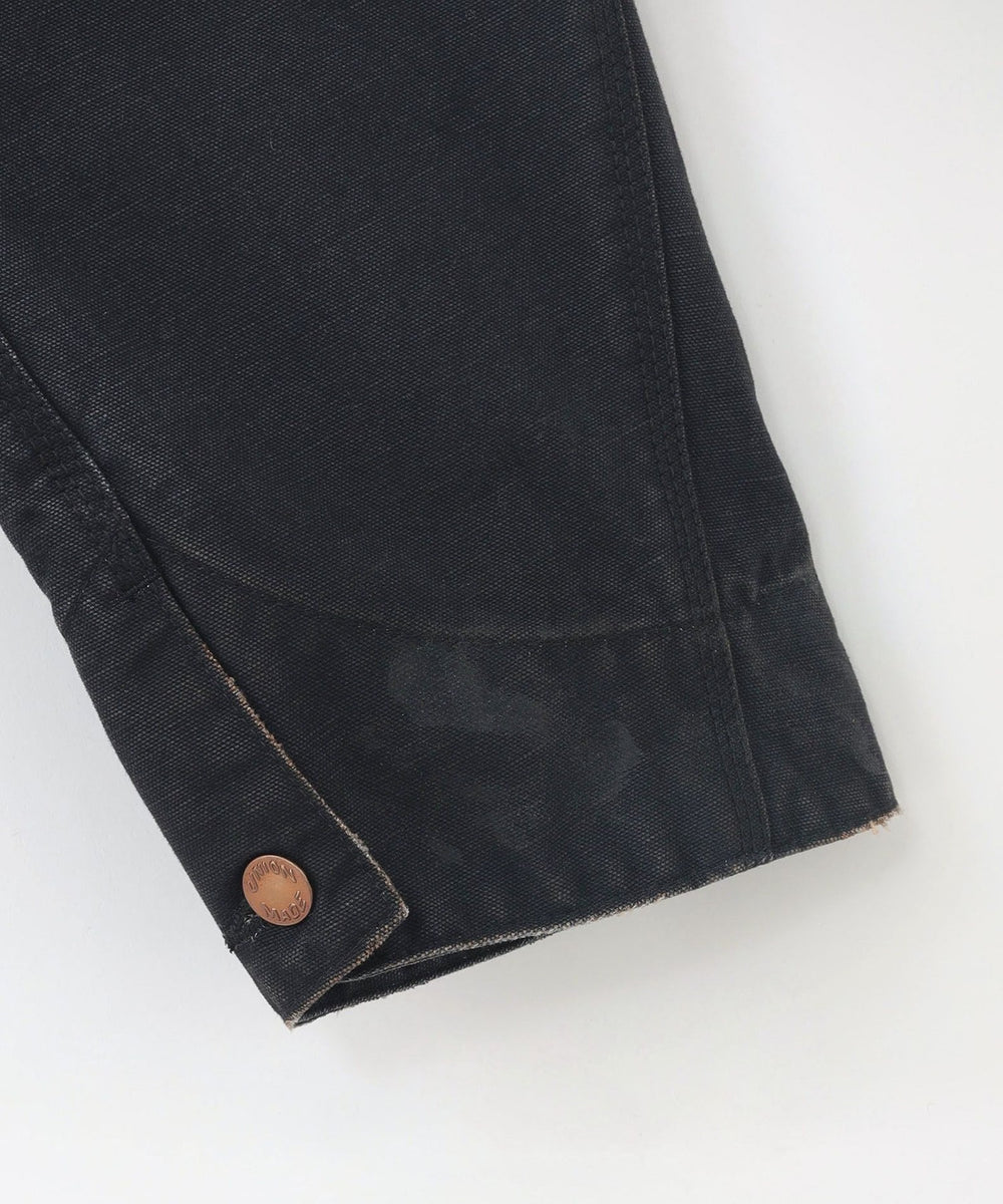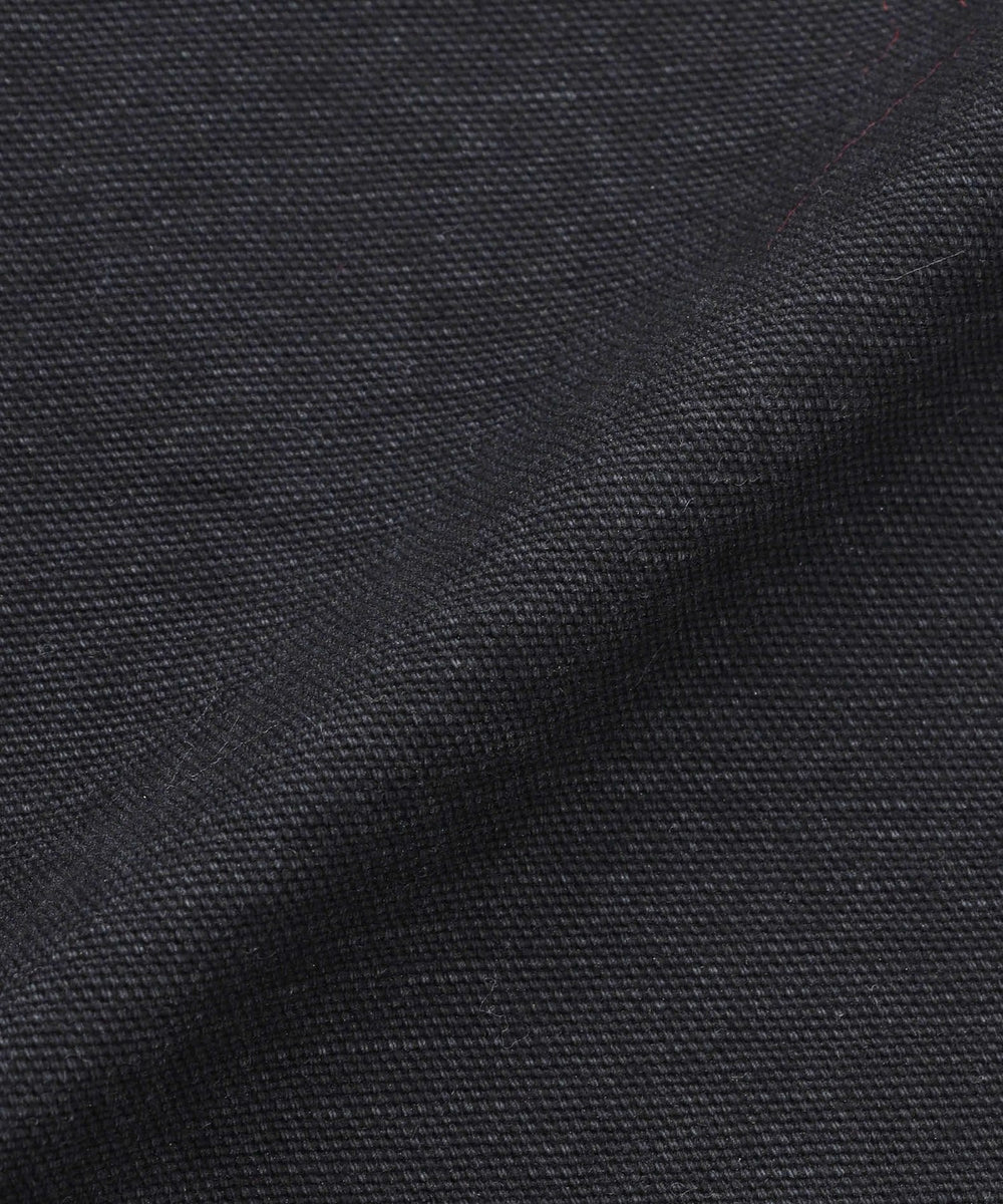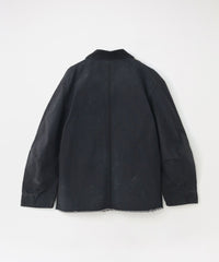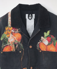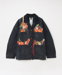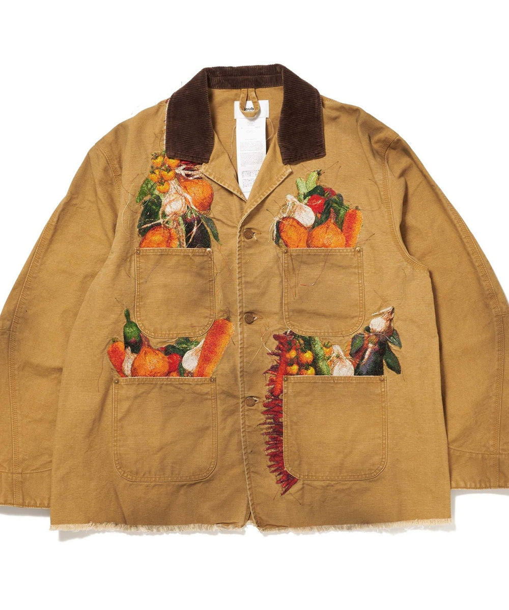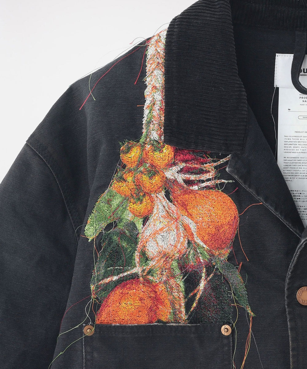 製品染めと洗いをかけたダック生地に、玉ねぎ、人参、ピーマン、にんにく、赤唐辛子、茄子などの野菜をリアルな刺繍で施したワークジャケット。