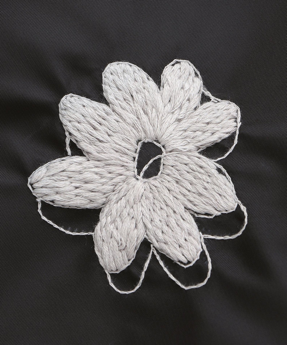 フライトジャケットならではの無骨さはありつつも、フラワー刺しゅうがアートピースのようなムードに。