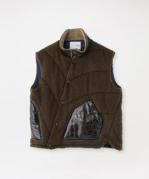 25AWコレクションのインラインにあるベスト(63F73-602)の襟部分とポケット部分を、他アイテムで使用されていたラミネート加工を施したエナメル調の生地で切り替えた別注。
