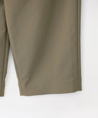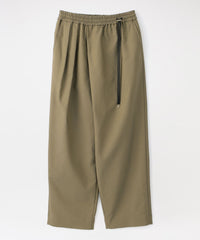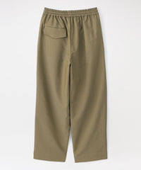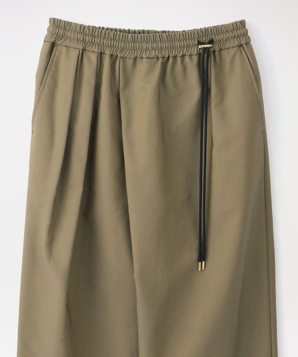 右前のみ2タック、フロントはラップパンツのような斜めのタック、左前はノータックで仕上げたアシンメトリーなゆったりとしたワイドシルエットが特徴。
