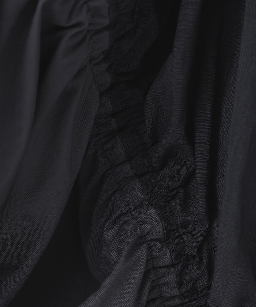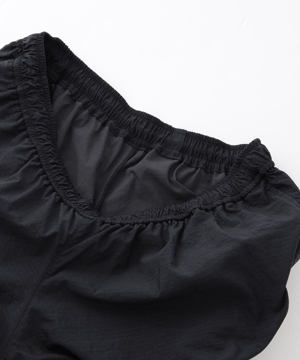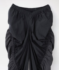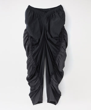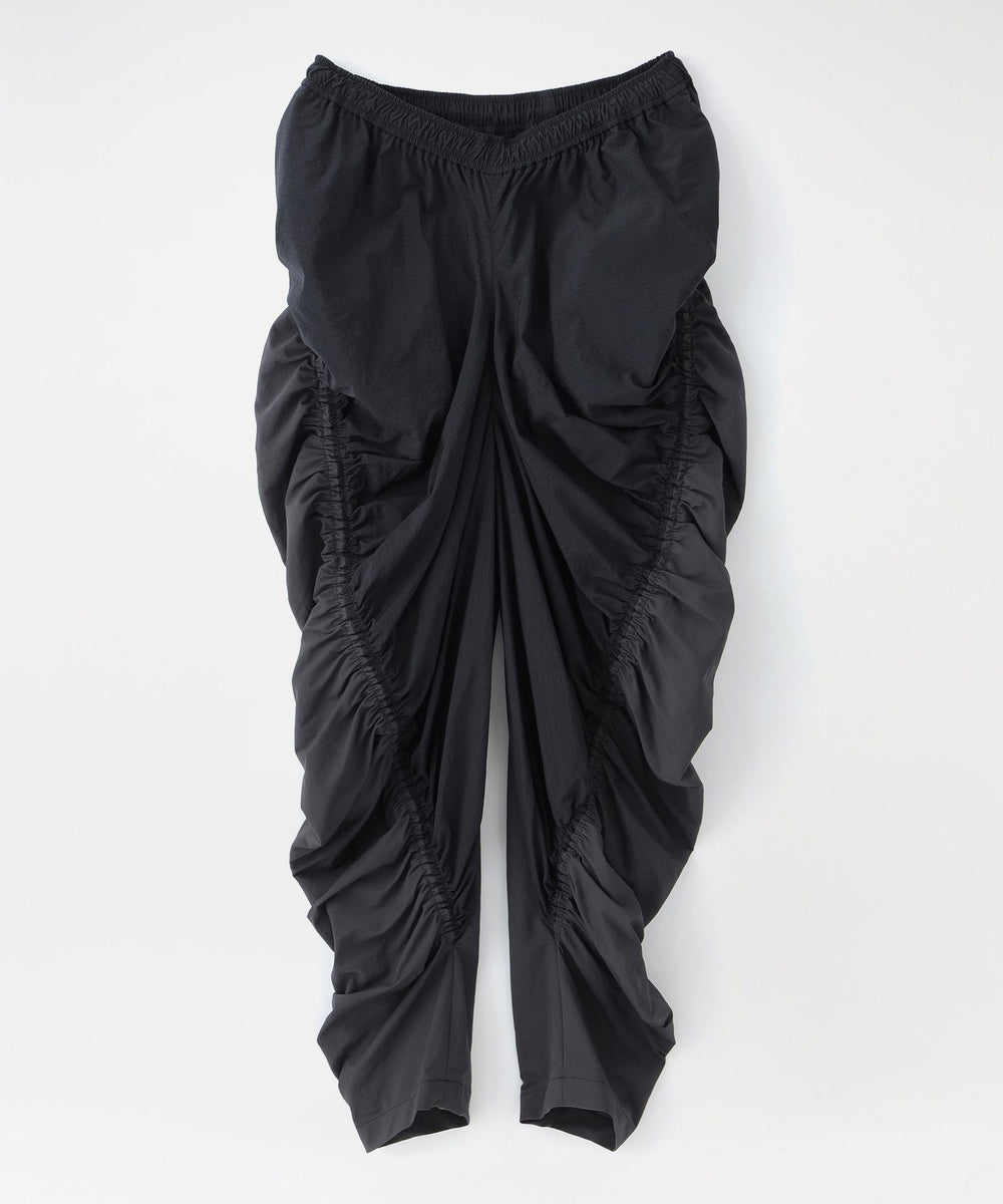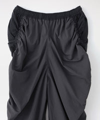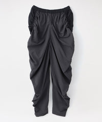 通常のパンツには見られないボリューム感をギャザーの技法で表現した唯一無二のデザイン。