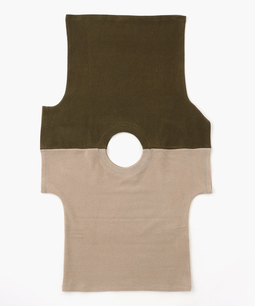 Tシャツが2枚繋がっているデザインで、身体を中に通すことで背中に片側のTシャツがぶら下がっているような着こなしになる。
