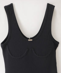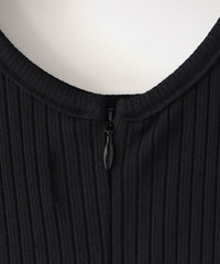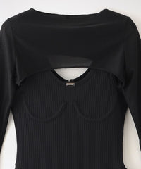 シースルー素材のトップレイヤーと、肉感のあるコットンリブなどの切り替えが目を引くワンピースです。