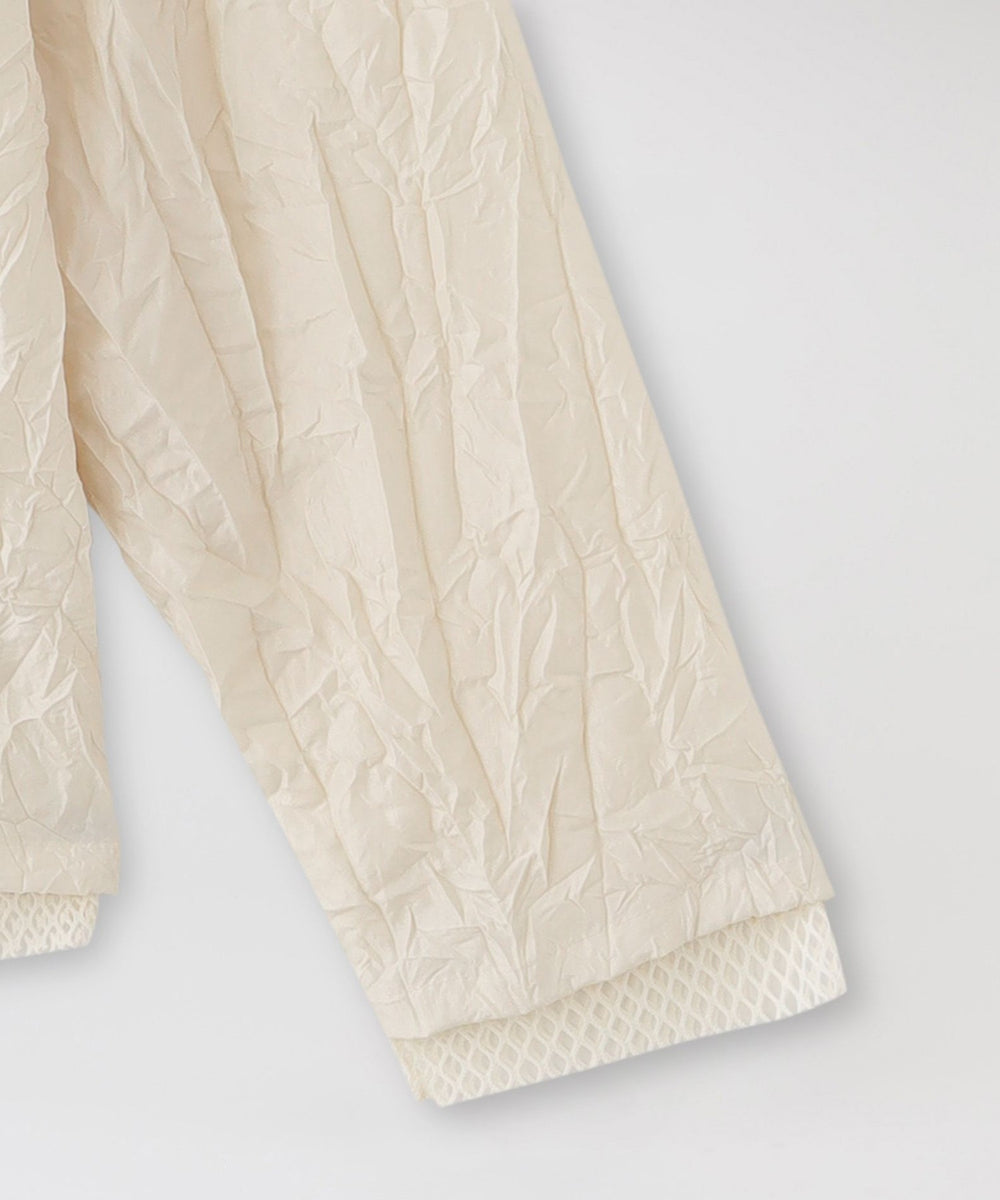 メッシュ素材を内側にして裾や袖から異素材のバランスを楽しむ着こなしがおすすめ。