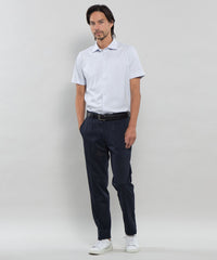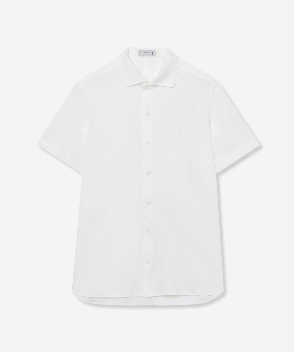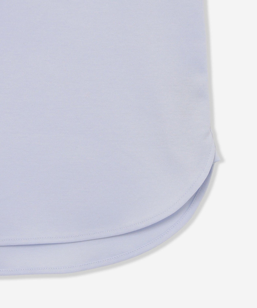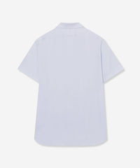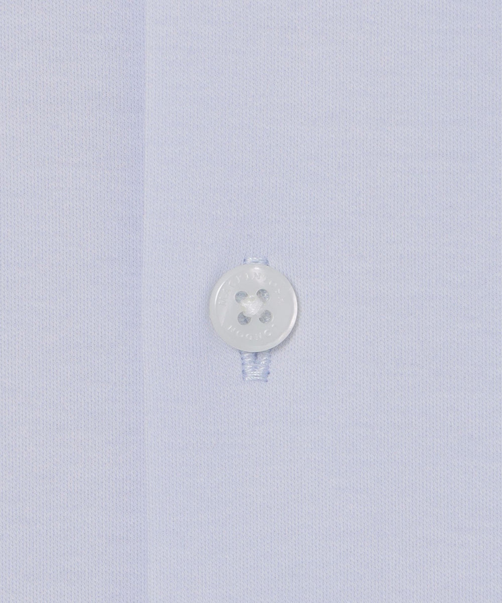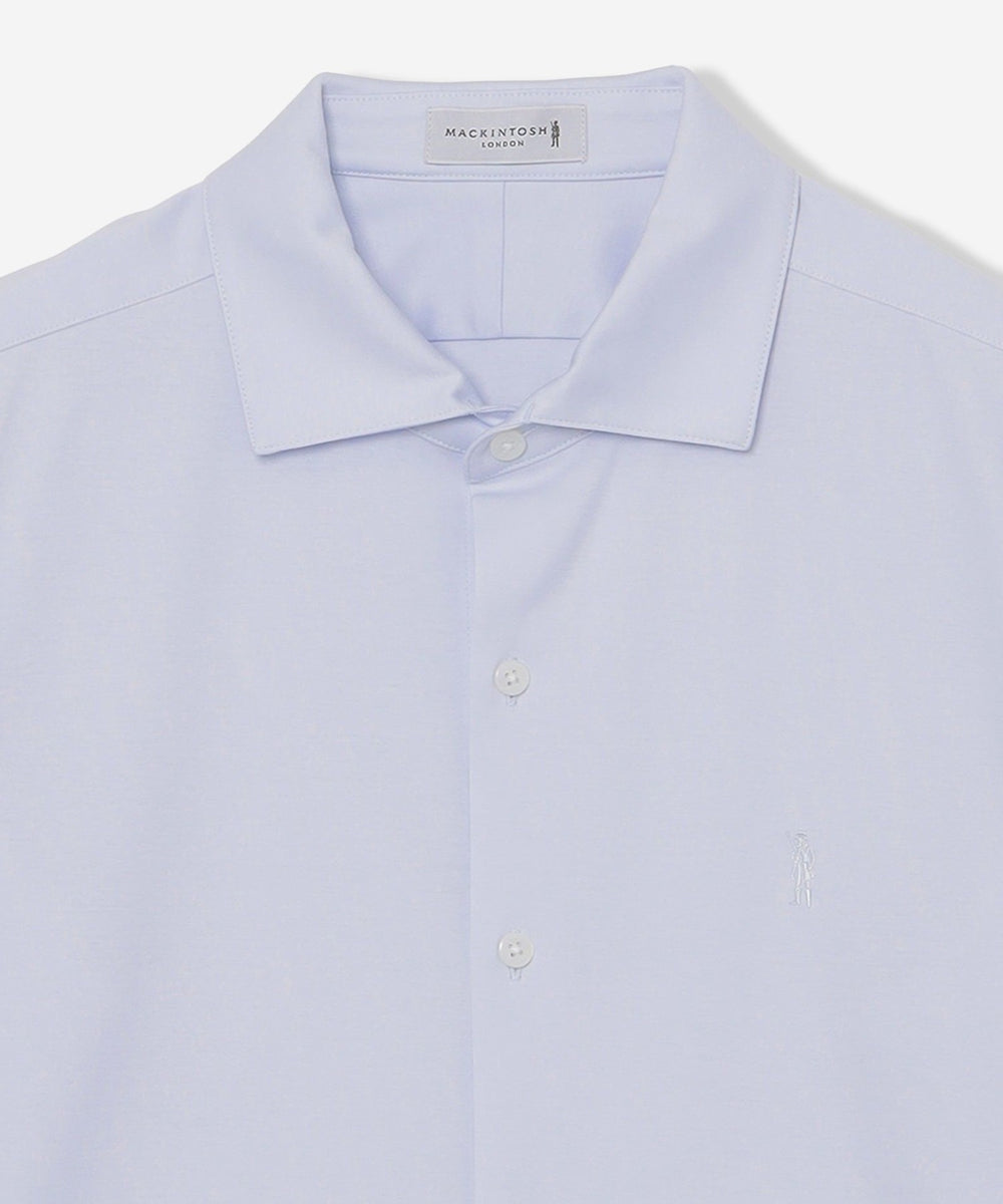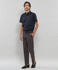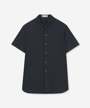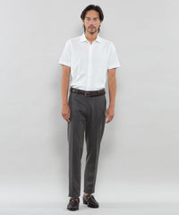ワイドカラーの前開きカットシャツです。ボディは定番のドレスシャツをベースに身体に程よくフィットするシルエットにしていますが生地にハリがあるので、身体のラインを拾い過ぎず着用時のシルエットがキレイです。ディティールもドレスディテールを意識し、裾はガゼット付きシャツテール、背ヨーク巾は狭めに設定し、エレガントな雰囲気を持たせました。左胸に同色でダンディマン刺しゅうが入ります。脇下にデオドラントテープを施すことで、消臭効果も付与しています。