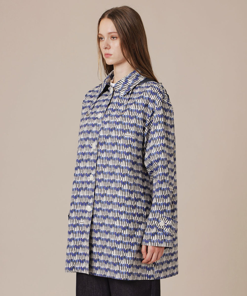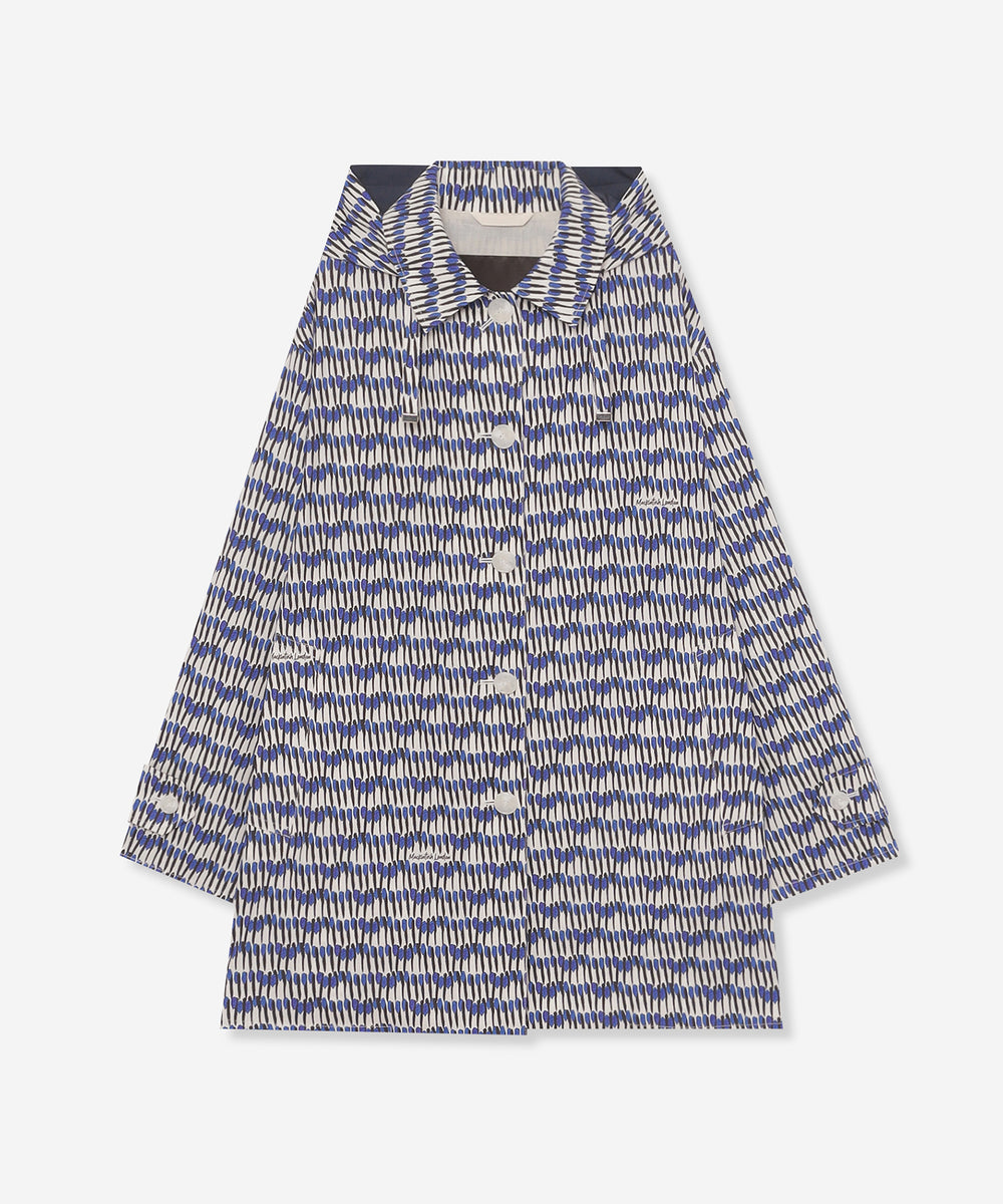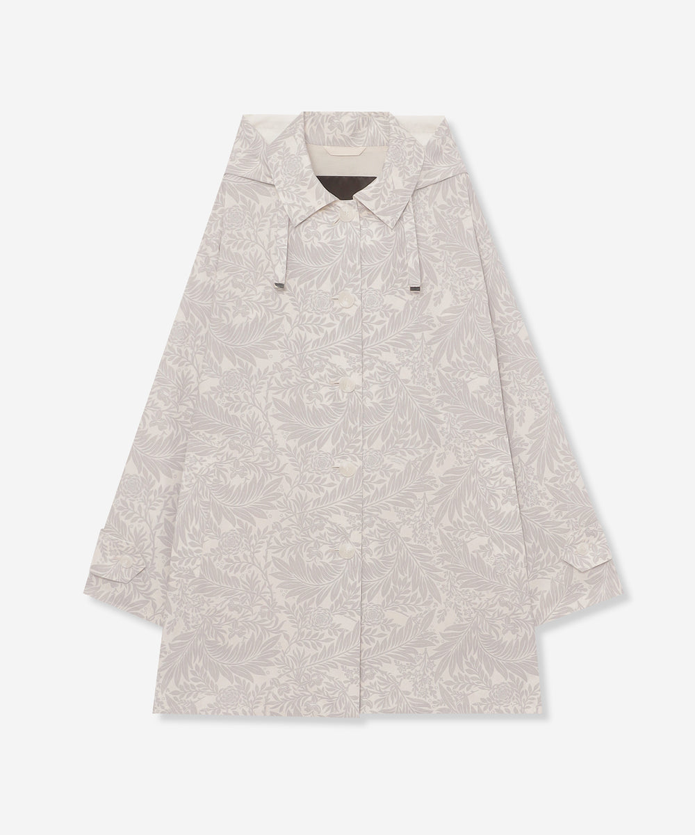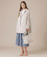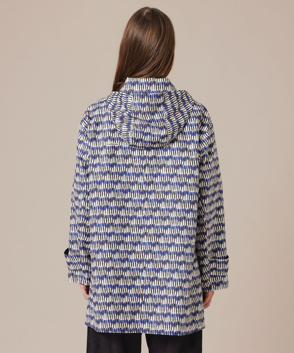 取り外し可能なフード付きレインコートです。優雅なシルエットで軽快な印象です。コートを収納出来るポーチが付属しています。背裏付きです。