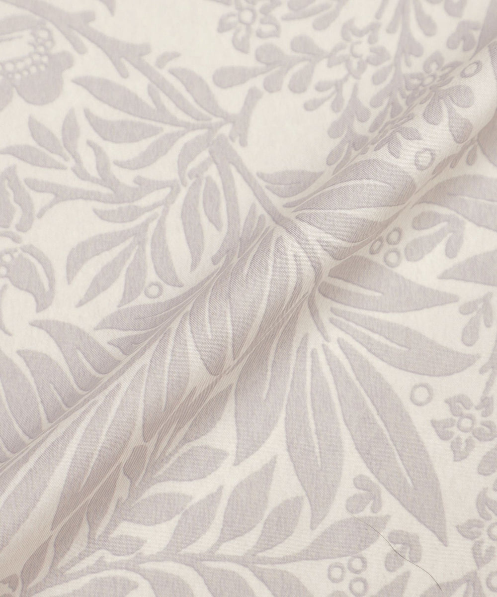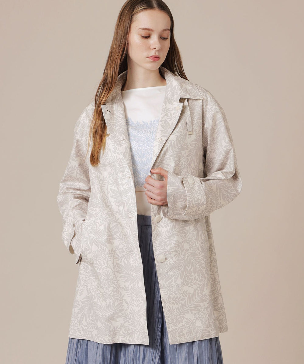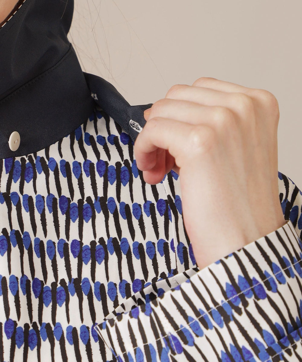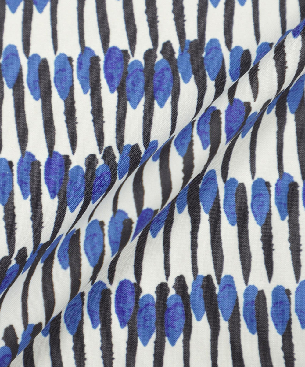 ソフトな風合いとドレープ性が特徴のポリエステルタフタに、ブランドオリジナルプリントを施した素材です。ブルー系(#25)はオリジナルの水滴をモダンにアレンジした「レインドロップ柄」、ベージュ系(#40)は爽やかな「リーフ柄」を繊細にプリントしています。